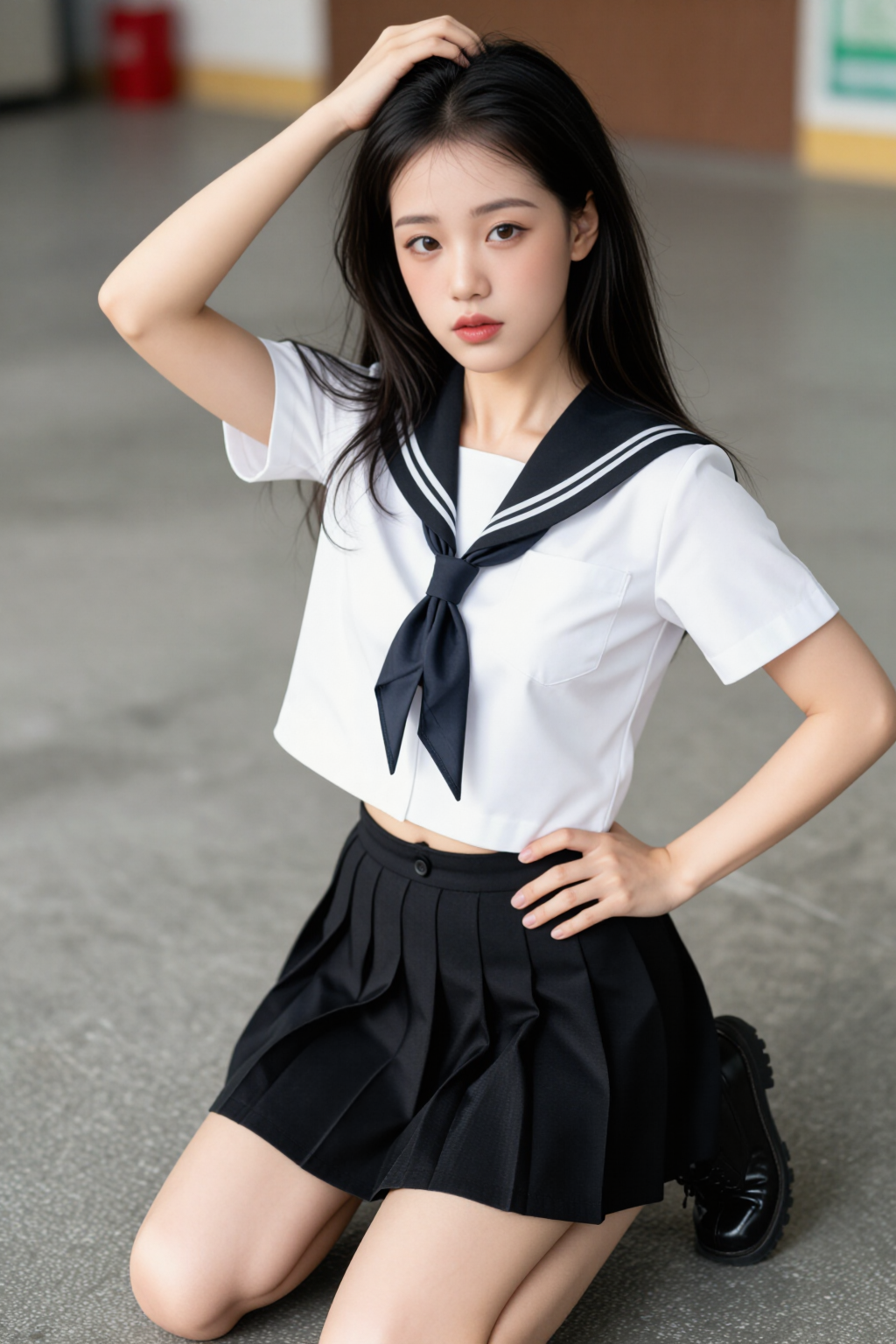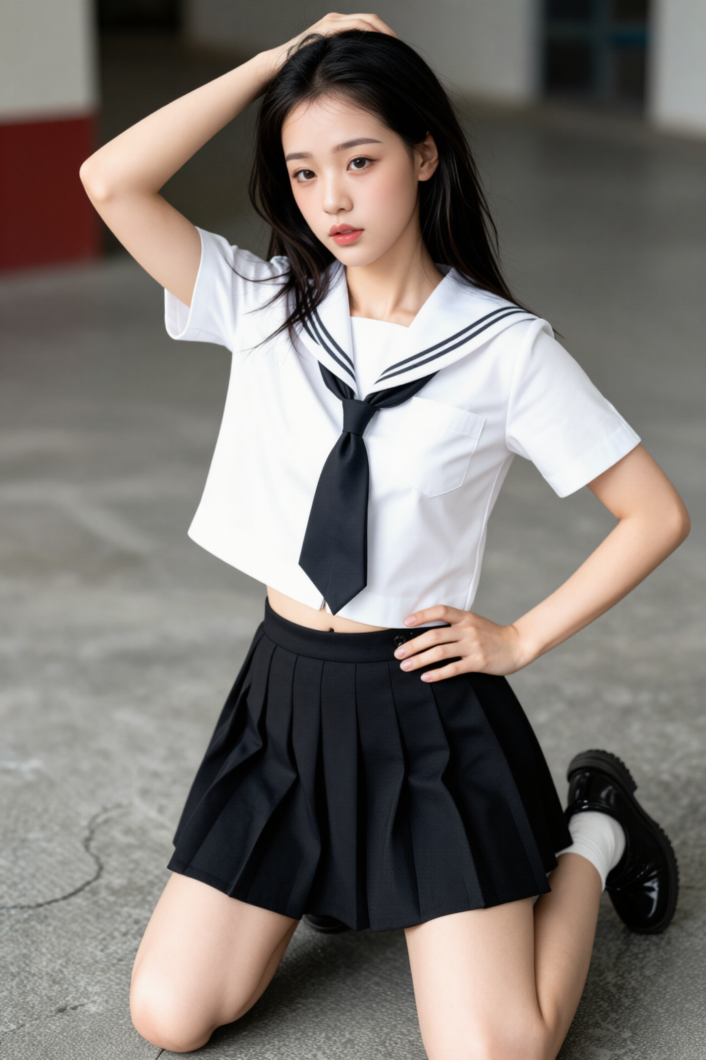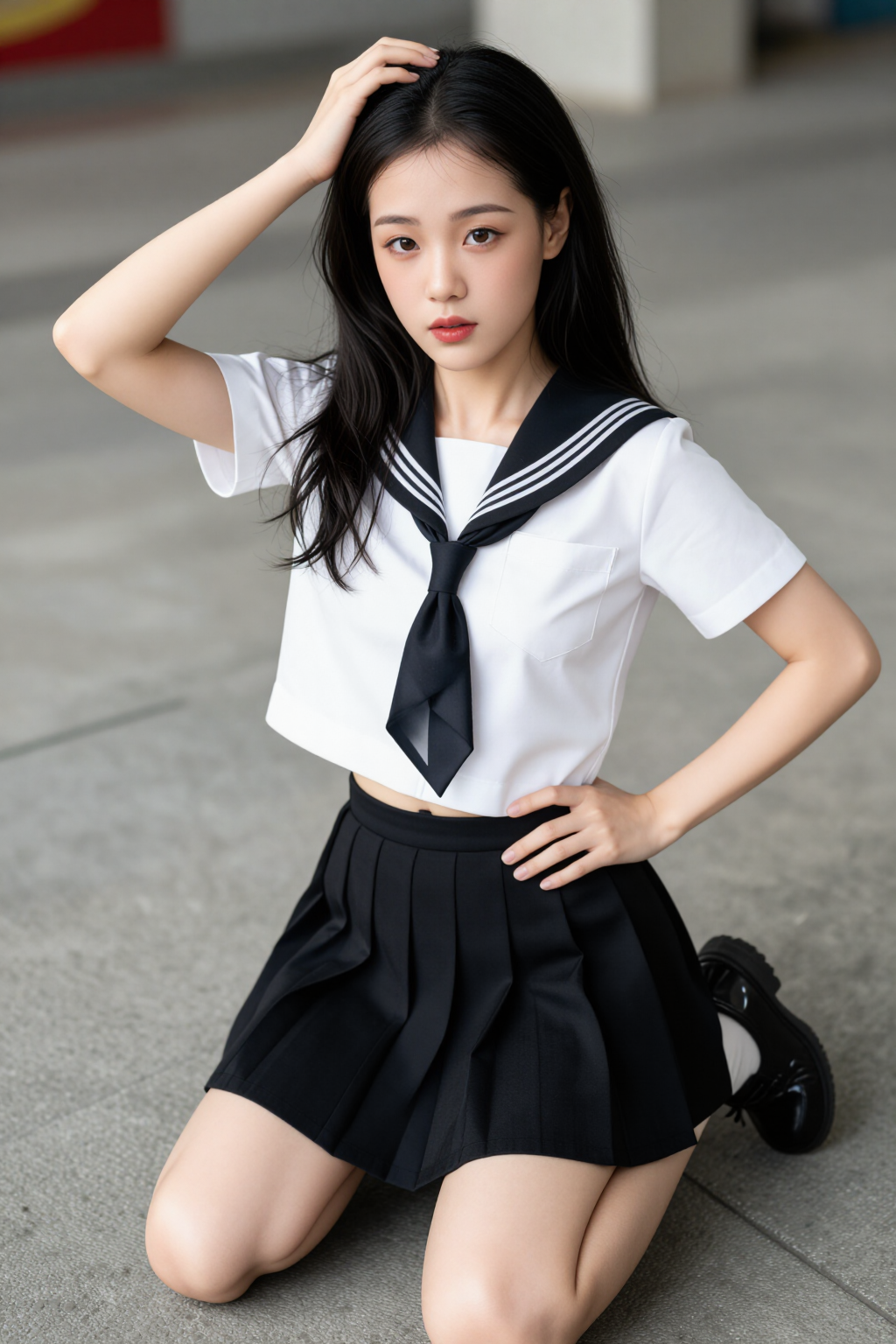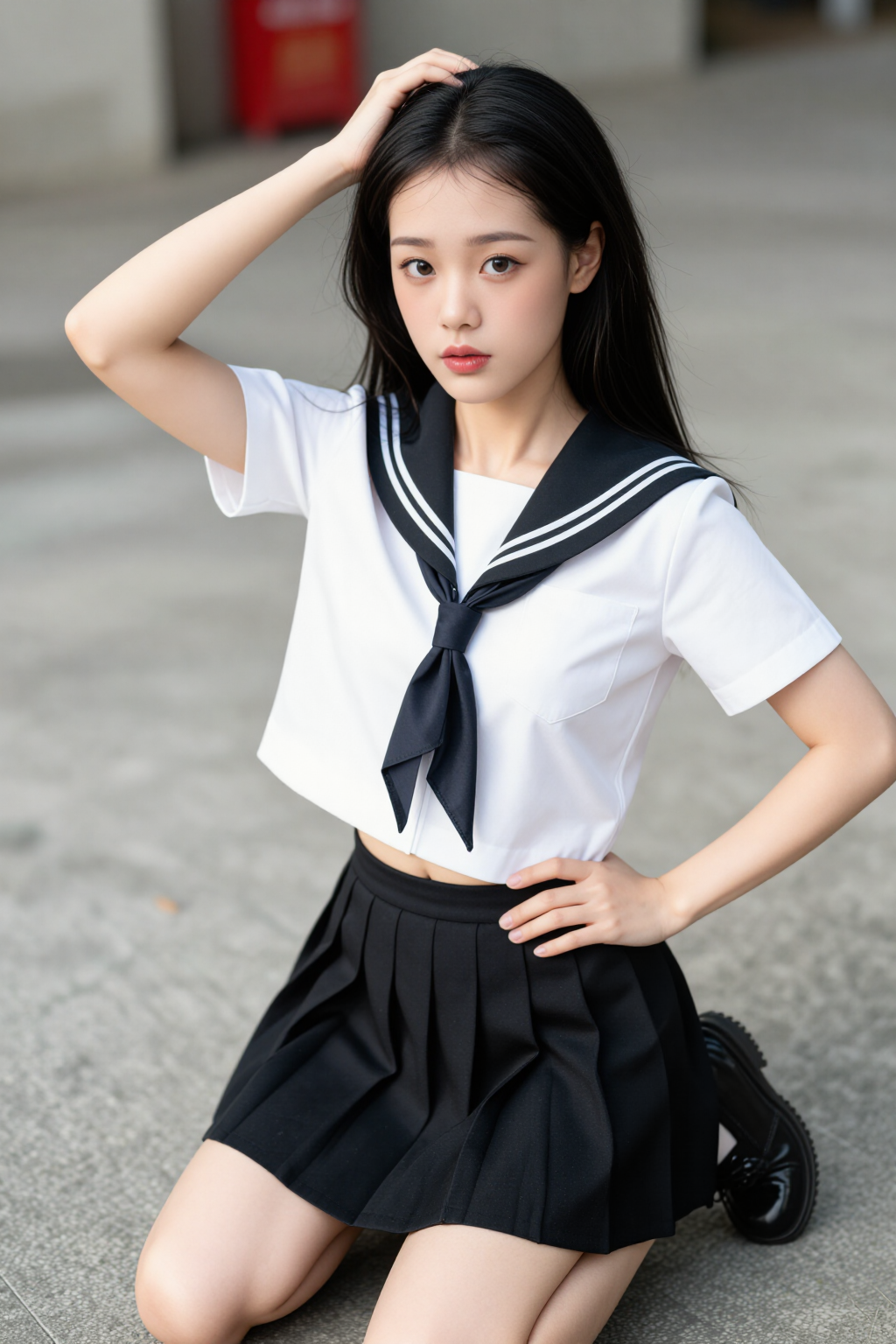 A字百褶裙是这套搭配的核心,经典的黑色百褶设计,既能巧妙修饰胯部和大腿线条,又能随着动作呈现出灵动的质感。裙长控制在大腿中部,刚好盖住最粗的部位,同时最大程度拉长腿部比例,小个子也能轻松驾驭。