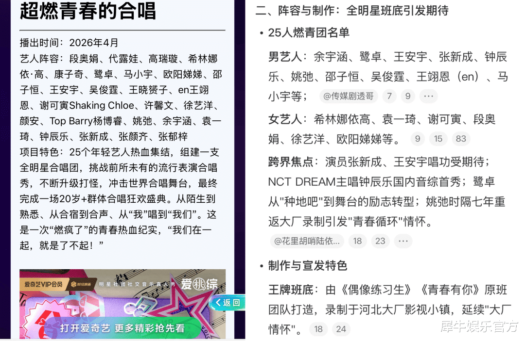 爱奇艺方面,在《爱奇艺2026-2027超级娱乐资源·综艺篇》里,《超燃青春的合唱》被摆在了第二重点推介位。尽管均为S+音综,该节目底层逻辑和蓝台不同,它首创了集结25位曾从《青你》等秀综里走出的偶像艺人或新生代人气跨界演员一起合宿“玩合唱团”的全新概念,实质上把音综爆改成了“内娱秀人改造实验”。
