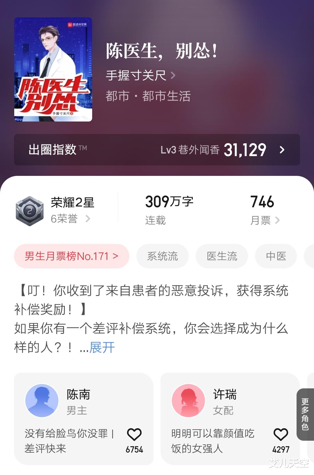 小说去年四月上线,写了不到一年两个月,总共三百多万字,中间也出过一些争议。成绩倒是一直挺稳定的,均订在一万五左右,中医文里算是很高的了。
