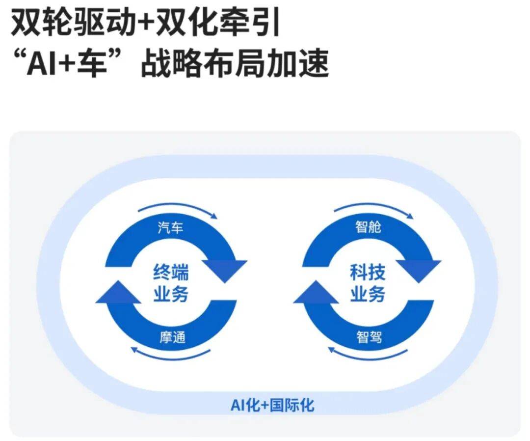 根据千里科技财报划分,公司业务划分为科技、终端两个板块,其中科技是撑估值故事的核心,主要聚焦于智能辅助驾驶与智能座舱技术,提供面向未来的汽车智能化整体解决方案。在2024年年报中,千里科技高调宣布,2025年将成为公司的历史性转折点,未来战略方向将是“双轮驱动,双化牵引”,双轮即摩托车、汽车的终端业务,以及智能驾驶、智能座舱的科技业务;双化即AI化、国际化,千里科技预计以AI技术为核心,将主营业务推向海外,全球布局。