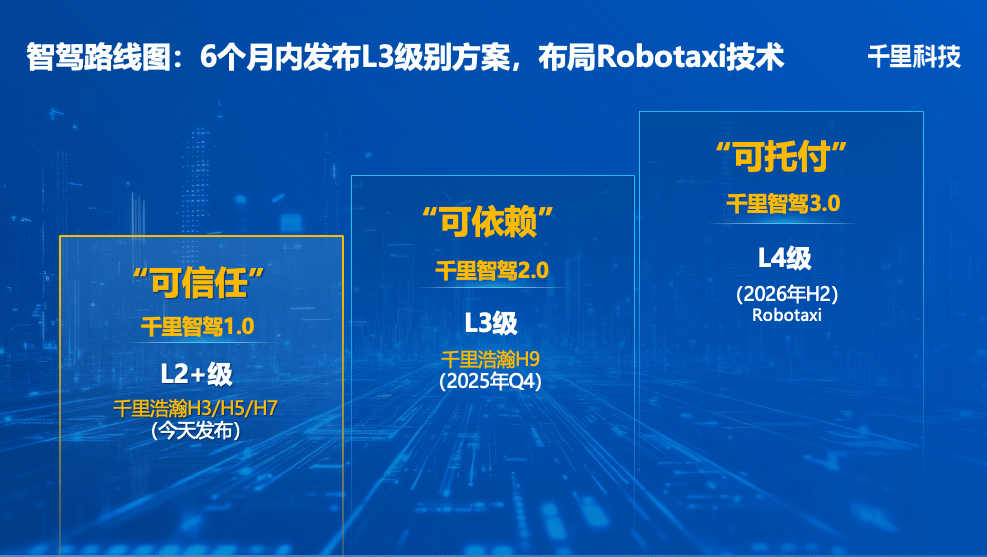 03 摆脱后发者困境对于全新整合的智驾体系,吉利将其命名为“千里浩瀚”,其中,“浩瀚”代表智驾能力,“千里”则代表行业领先的通用大模型和算力。这套系统覆盖H1、H3、H5、H7、H9共五大层级,从基础的高速NOA、智能泊车到高端的城市无图NOA均有覆盖,吉利的战略规划是,让五级智驾覆盖吉利未来全系车型,以追赶比亚迪掀起的智驾平权浪潮。