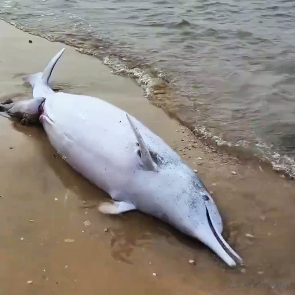 这是近日出现在广东湛江一处沙滩上的令人痛心的一幕,一只小海豚只露出了小半截身体,母子俩均已死亡。经当地警方初步调查,系难产死亡后被海浪冲上沙滩。