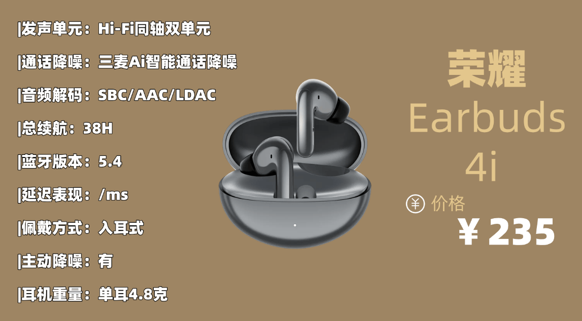 2.音质方面,荣耀Earbuds 4i搭载Hi-Fi同轴双单元,由0.25mm超薄陶瓷高音单元和11mm镀钛低音单元组成,低频扎实有力,高频清晰透亮,中频略显温润,整体层次感清楚。支持LDAC高清音频传输及Hi-Res金标认证,最高码率可达990kbps,保证细节还原度。耳机内置智慧深度降噪3.0,最高降噪可达50dB,并提供三档调节与双通透模式。蓝牙5.4协议加持,支持双设备快速切换,连接稳定低延迟。续航方面,单次使用约8小时,总续航38小时,充电10分钟即可播放2小时,满足日常全天使用需求。