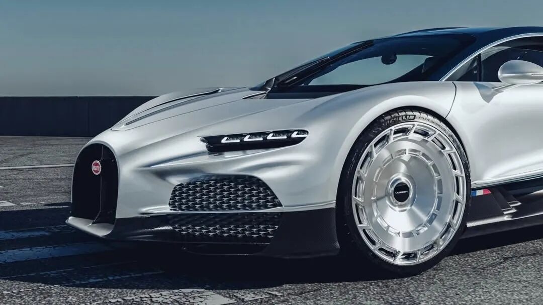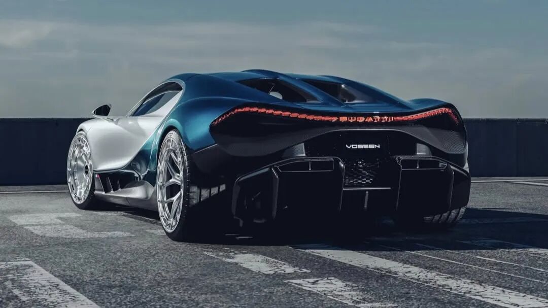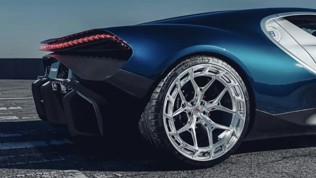 再看后轮,设计师并未采用与前轮相同的款式,而是在后轮安装了Vossen的LC3-01T轮毂,并且采用了高光拉丝表面处理。虽然这些轮毂的造型极具攻击性,但装配在布加迪这样本该高端、优雅的车型上,看起来还是略显突兀。