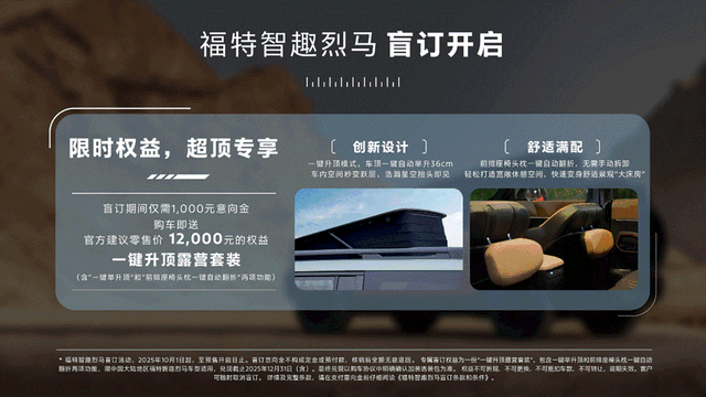 2025年10月1日,中国上海——福特品牌旗下全新力作车型,福特智趣烈马正式开启盲订。即日起至预售开启前,用户仅需通过“福特纵横小程序”支付1,000元盲订意向金,成为福特智趣烈马盲订客户,即可获赠官方建议零售价人民币12,000元的“一键升顶露营选装包”,包含行业首创的原厂电动举升顶和前排座椅头枕一键自动翻折两项功能,打造跃层式车内空间,尽享星空视野。