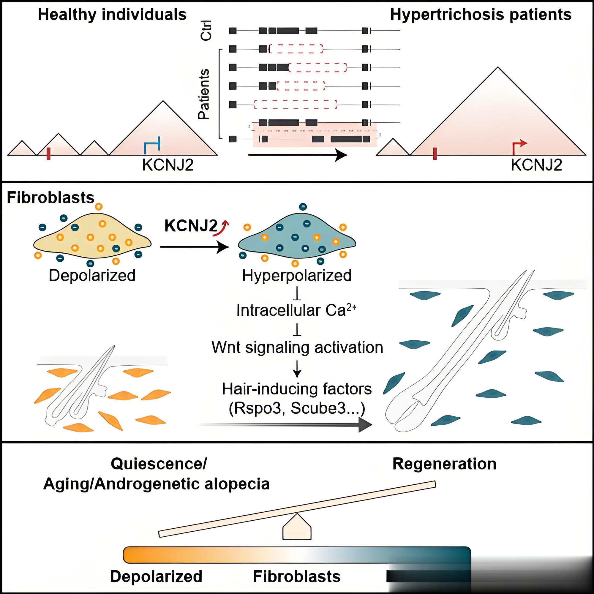 一、研究的起源:先天性全身多毛症的启示研究的开端聚焦于一种罕见的遗传病 —— 先天性全身多毛症(Congenital Generalized Hypertrichosis Terminalis,CGHT),患者全身毛发异常浓密,犹如 “狼人”。虽然这种疾病给患者带来诸多困扰,但却为科研人员探索毛发生长机制提供了独特视角。研究团队针对五位 CGHT 患者的基因组展开分析,运用 “高通量染色体构象捕获”(Hi - C)技术,发现尽管患者的基因突变各不相同,但均破坏了 17 号染色体上特定区域的拓扑关联结构域(TAD)。这一变化使得 KCNJ2 基因与原本不应接触的成纤维细胞增强子相互作用,导致 KCNJ2 基因在真皮成纤维细胞中异常上调,而在其他皮肤细胞如角质形成细胞、免疫细胞中无此现象。至此,KCNJ2 基因成为研究毛发生长机制的关键 “嫌疑人”。
