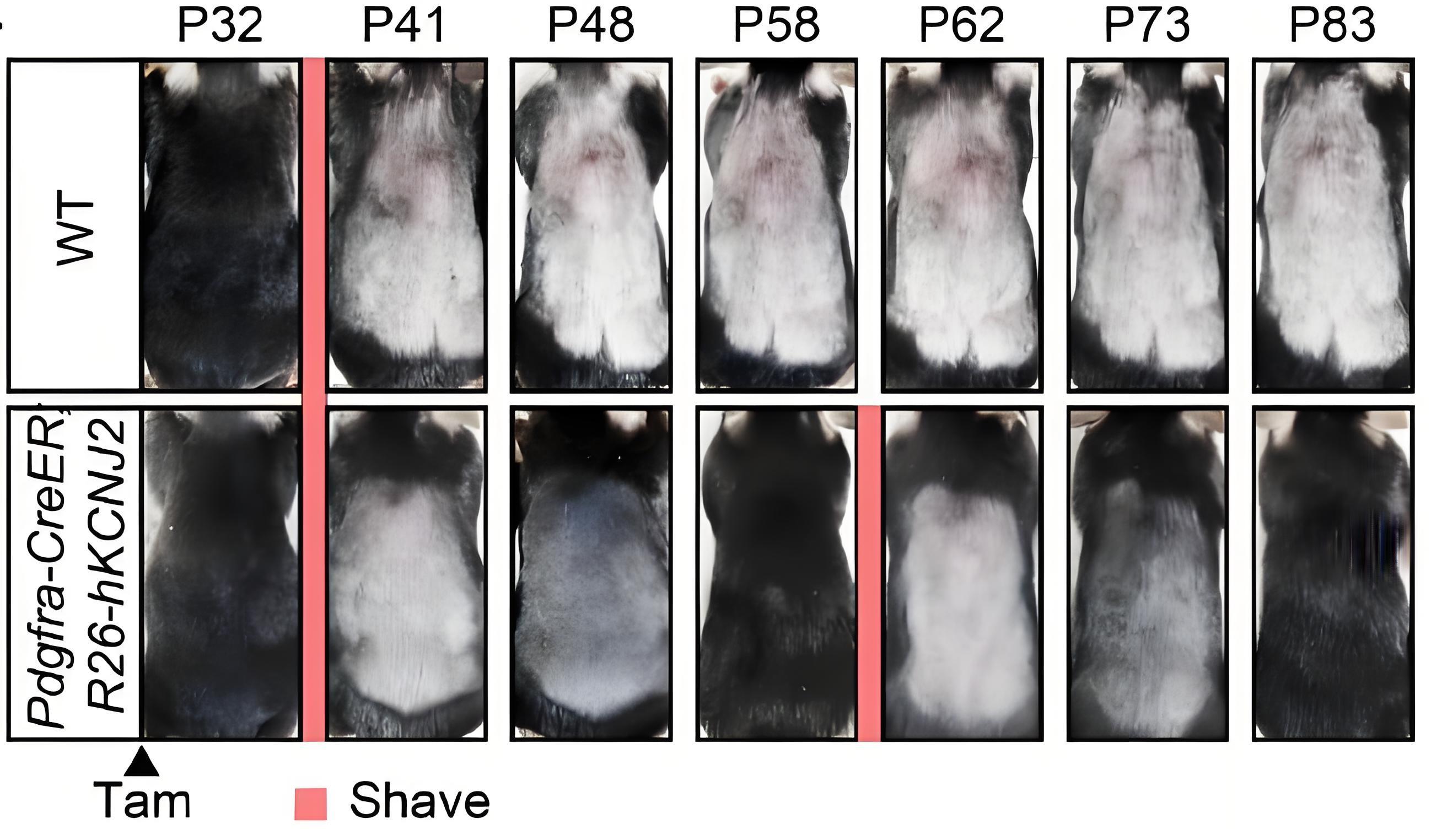 二、验证关键基因:小鼠实验的突破为证实 KCNJ2 基因过度活跃是毛发疯长的根源,研究人员构建了 “条件性激活” 小鼠模型(R26 - hKCNJ2)。通过不同的 “细胞钥匙”(如 K14 - Cre、Tek - Cre、Csf1r - Cre、SM22 - CreER、Pdgfra - CreER),在小鼠皮肤的不同细胞类型中开启 KCNJ2 基因。结果显示,在前四组小鼠中,激活 KCNJ2 基因对毛发生长周期无影响,而在成纤维细胞中激活 KCNJ2 基因的 Pdgfra - CreER 小鼠,毛囊生长出现惊人变化。正常小鼠毛囊在出生后第 42 天进入休止期,这些基因工程小鼠的毛囊在第 48 天就迅速进入新的生长期,且在约 40 天内完成两个完整毛发生长周期,毛囊休止期从约 50 天大幅缩短至 2 天,毛发更长更粗壮。这有力证明了在成纤维细胞中特异性激活 KCNJ2 基因,能够驱动毛发持续、快速生长。