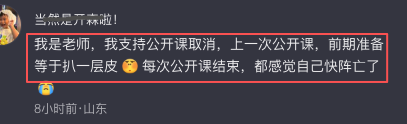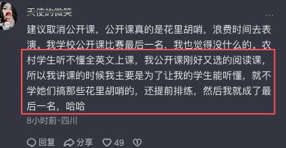 更值得反思的是那种“为了评委而教”的失真。一位四川的英语老师在评论区说,明明是农村学校,学生基础薄弱,为了迎合评委喜欢的“国际范儿”,硬是搞全英文教学,结果学生听不懂,公开课拿了最后一名。“我只想让孩子听懂,不想搞花里胡哨”,这句大实话背后,是无数一线教师被评审标准困扰的现实。