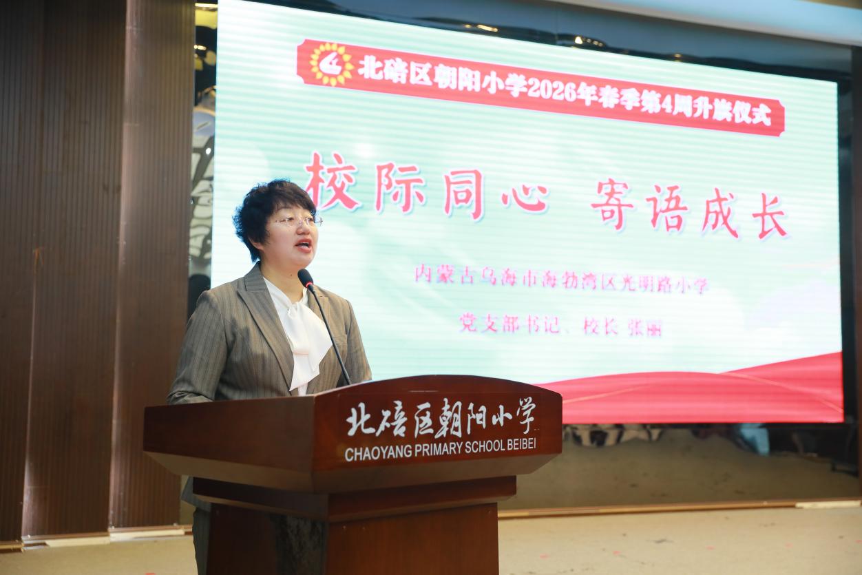 朝阳小学党总支书记赵铭在欢迎仪式上发表致辞,深情回顾了两校十五年来的携手历程。她表示,十五载风雨同行,两校从共同教研的思维交锋,到实地走访的温情相伴,从家庭接待的真诚互动,到师生往来的纯真情谊,这份缘分历经岁月沉淀,早已超越单纯的校际合作,成为教育同心、守望相助的精神纽带。“志合者,不以山海为远。”赵铭书记坦言,重庆的山水相依与乌海的湖光潋滟虽相隔千里,但两校深耕教育、共育新人的赤诚从未阻隔。