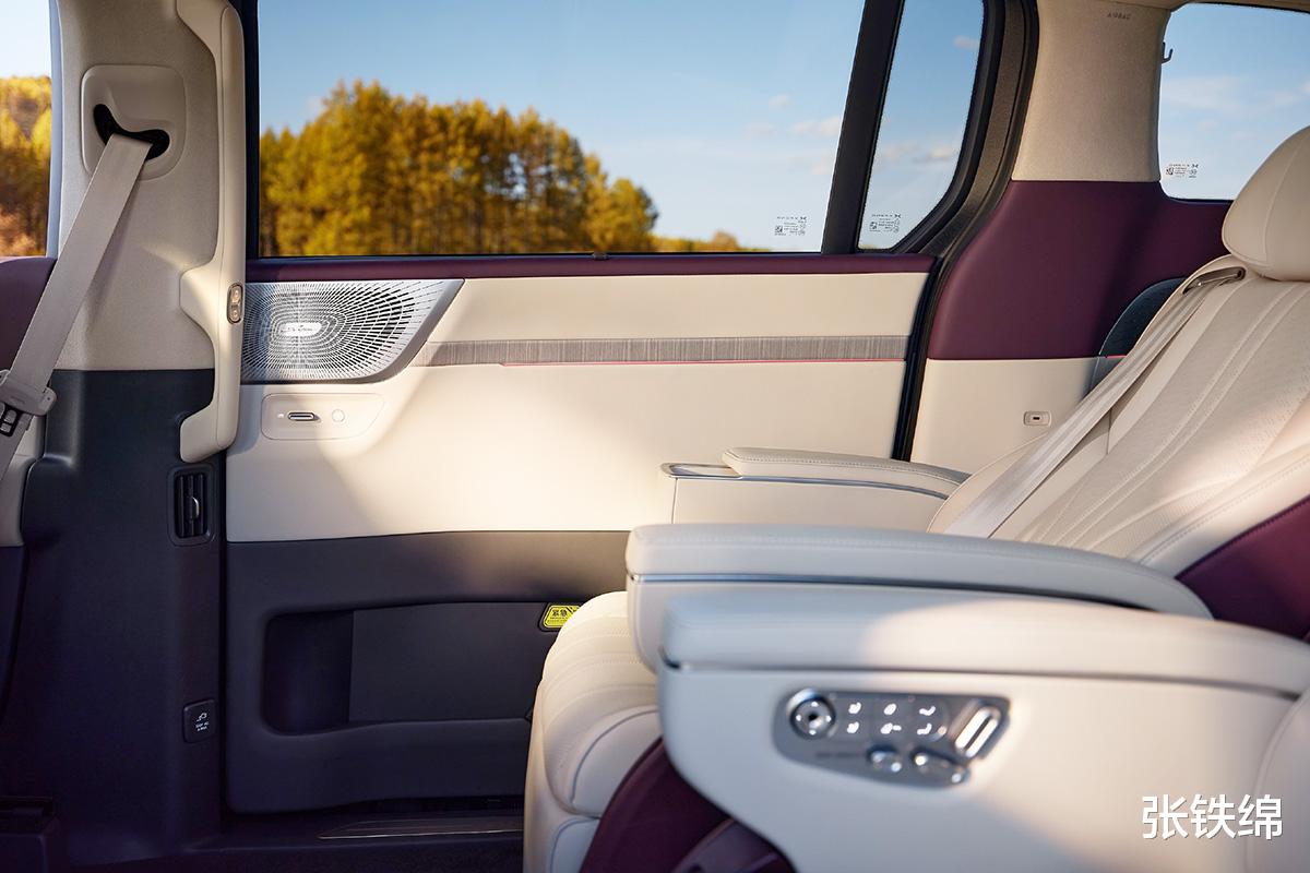 后排车门上也是使用了新的音响盖板,还使用了贯穿式的木纹饰条。增程版继续使用2+2+3式的座椅布局,第二排提供双零重力座椅,并在扶手内侧配备座椅功能调节按键。车顶配备21.4英寸二排娱乐屏,还带有环绕式氛围灯。