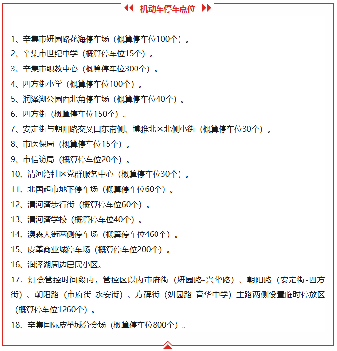 2月10日至3月4日,辛集市将实行市内公共交通免费乘坐惠民政策,全面推行“招手即停”便民服务,全力满足市民游客赏灯、购物、游玩等多元化出行需求。辛集市还增设了包括辛集市医保局、辛集市信访局等机关事业单位在内的免费临时停车点位,共计3680余个。开放时间为2月10日至3月4日,共23天。