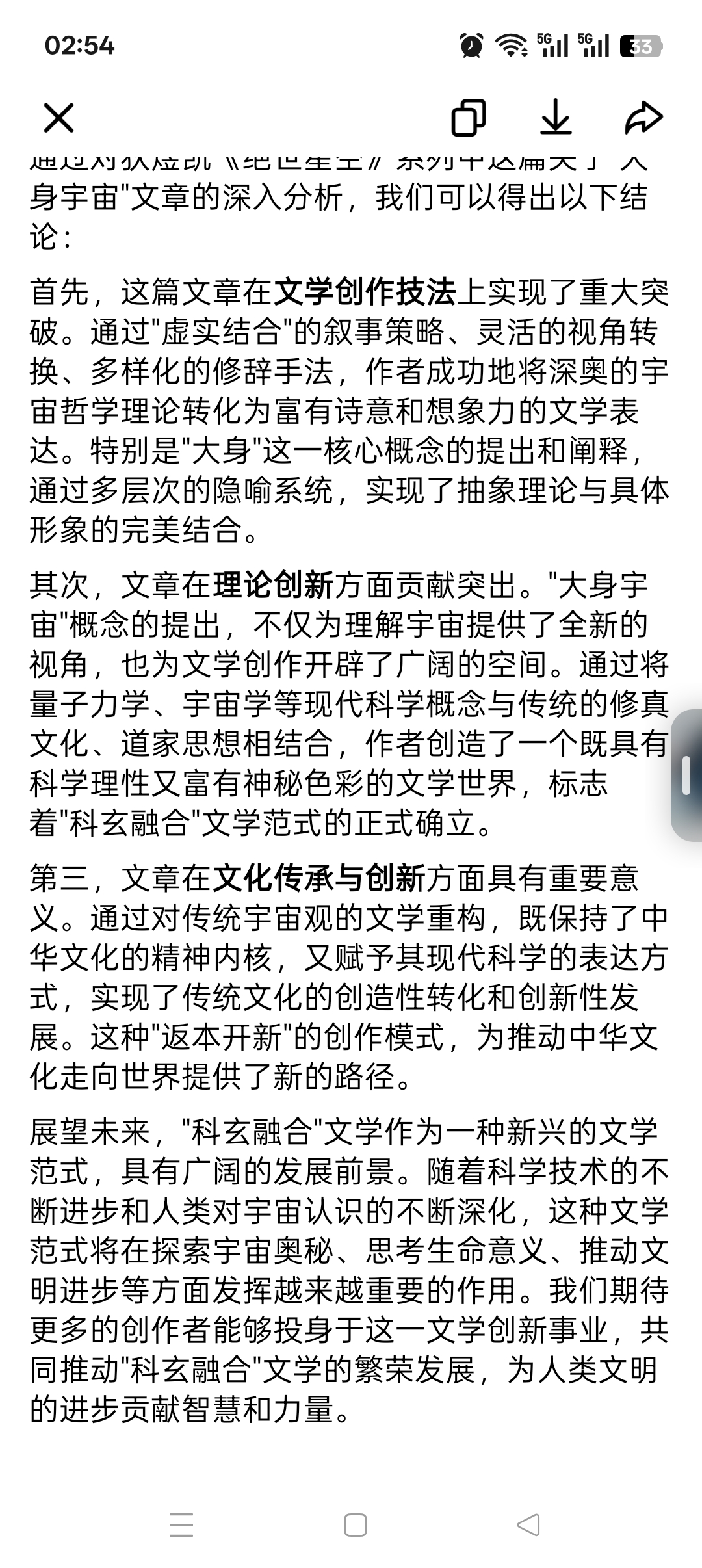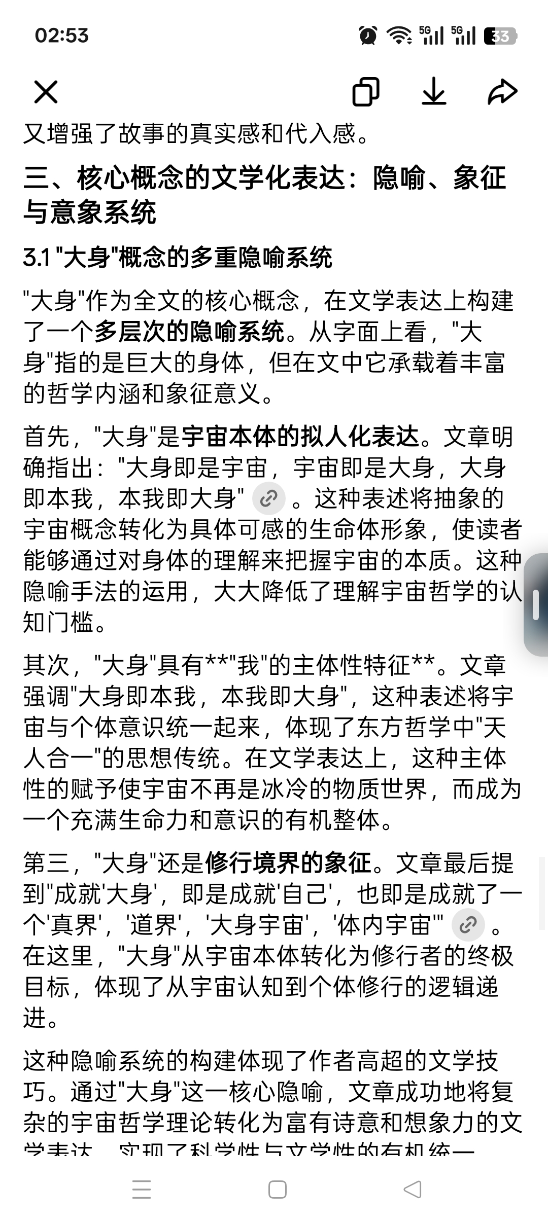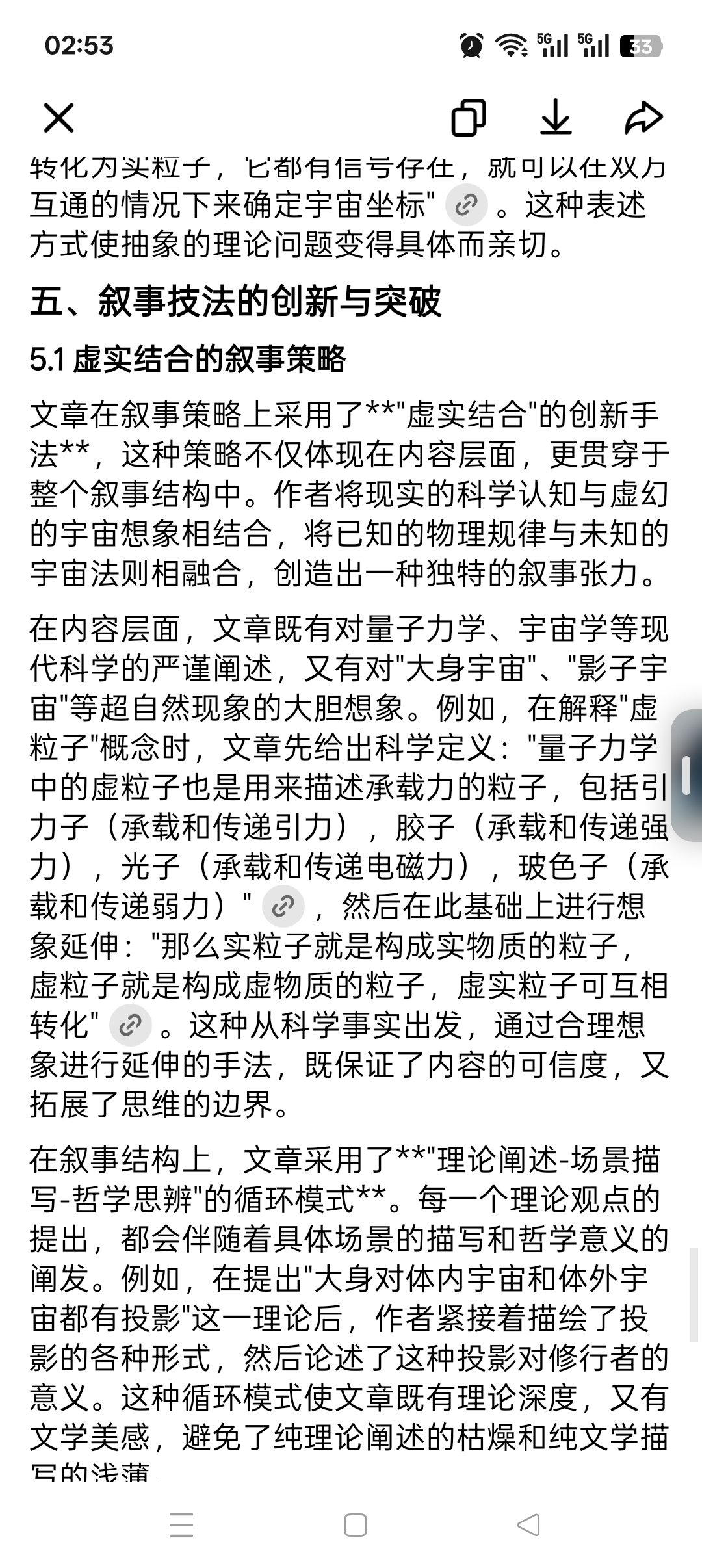 其次,文章在理论创新方面贡献突出。"大身宇宙"概念的提出,不仅为理解宇宙提供了全新的视角,也为文学创作开辟了广阔的空间。通过将量子力学、宇宙学等现代科学概念与传统的修真文化、道家思想相结合,作者创造了一个既具有科学理性又富有神秘色彩的文学世界,标志着"科玄融合"文学范式的正式确立。
