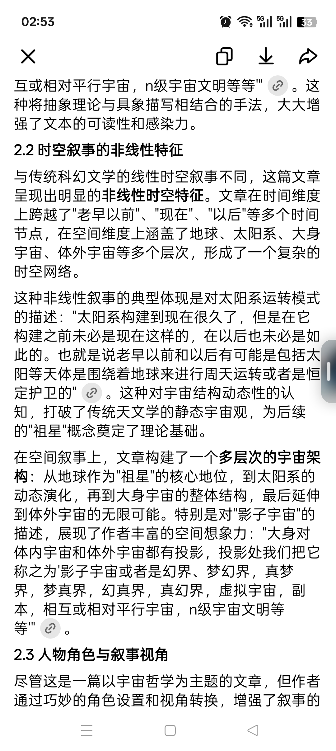 文章还运用了大量的时空跳跃技巧。在时间维度上,作者自如地在过去、现在、未来之间穿梭,如"老早以前和以后有可能是包括太阳等天体是围绕着地球来进行周天运转"的表述;在空间维度上,作者在地球、太阳系、大身宇宙、体外宇宙等不同层次间跳跃,如从"祖星"的描述突然转向"两个'大身'交汇处"的描写。这种时空跳跃不是随意的,而是服务于主题表达的需要,通过空间的拓展和时间的延伸,展现了宇宙的无限可能性。