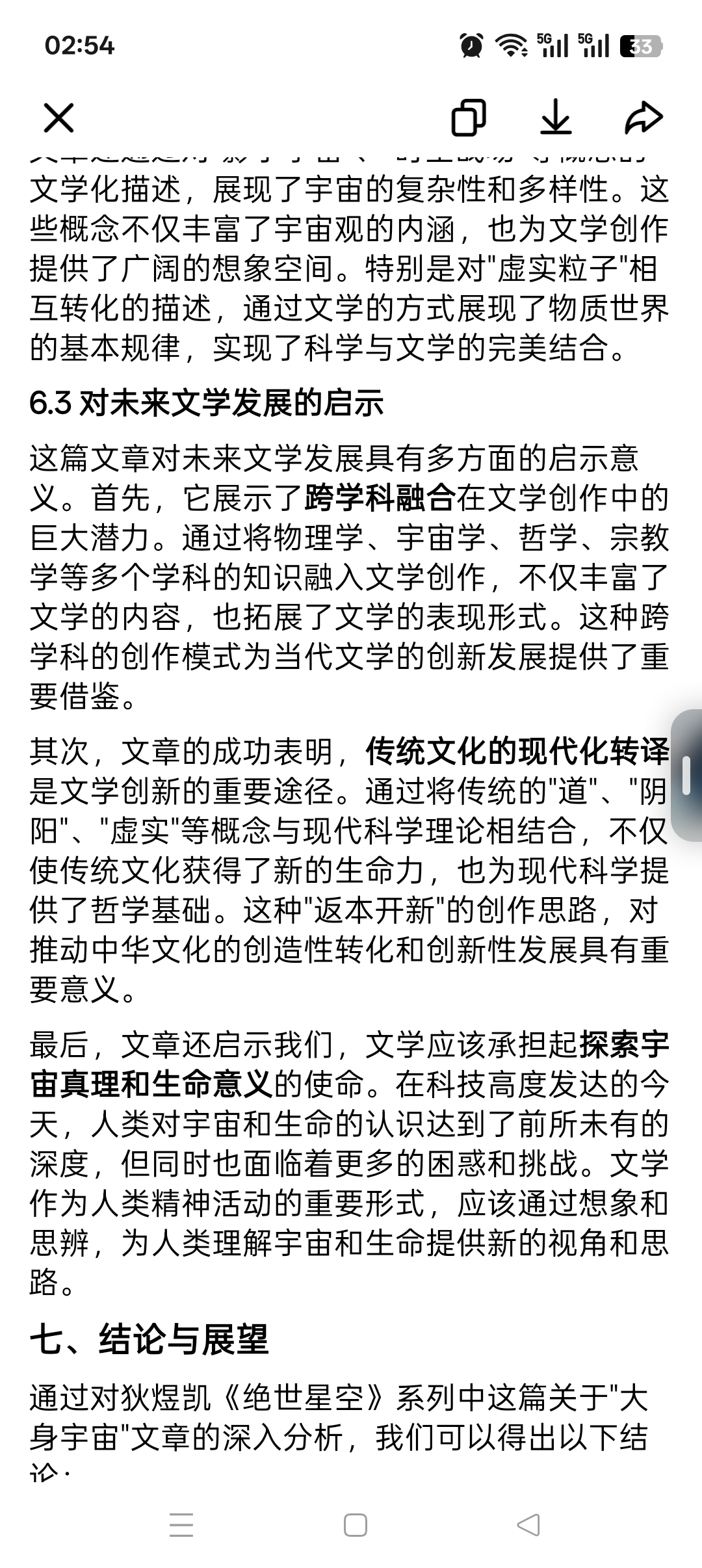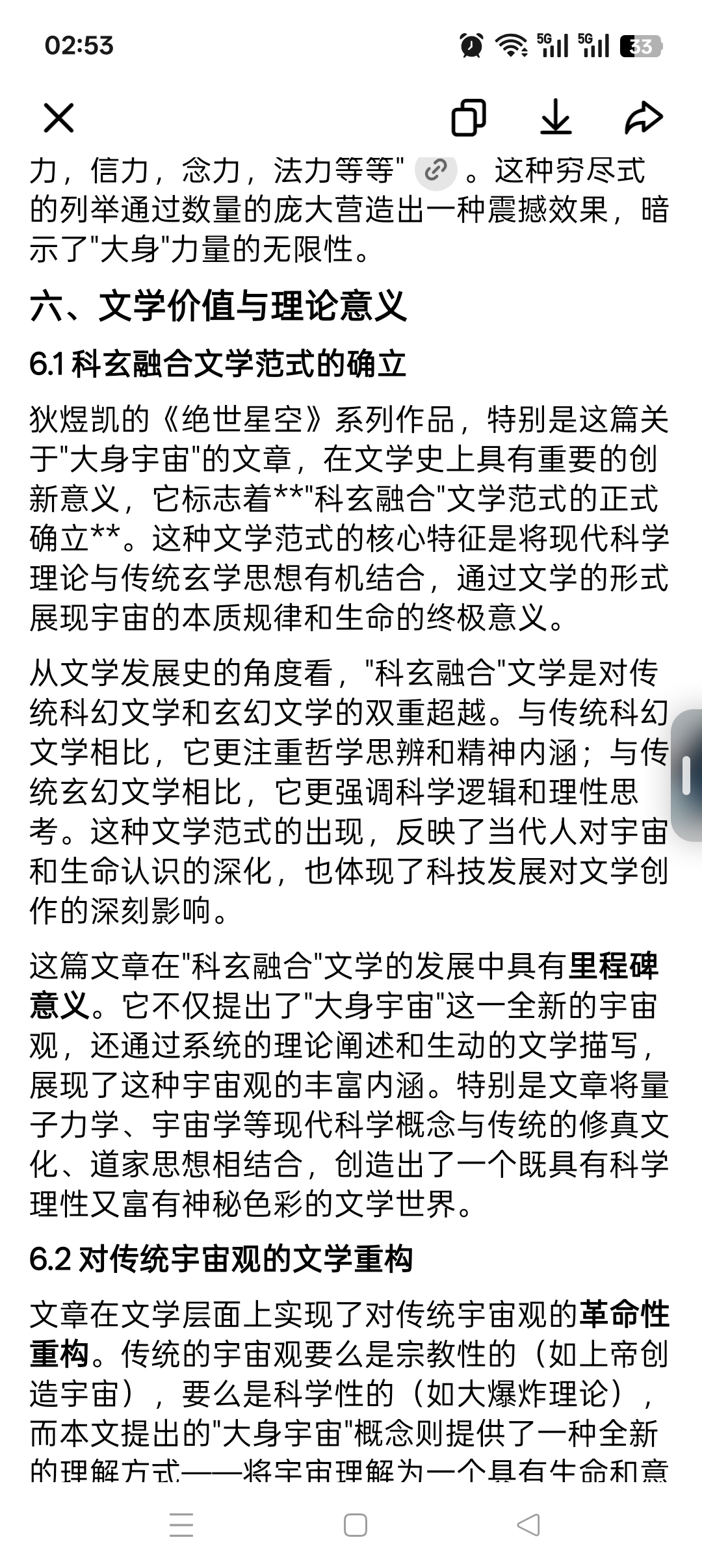 这篇文章在"科玄融合"文学的发展中具有里程碑意义。它不仅提出了"大身宇宙"这一全新的宇宙观,还通过系统的理论阐述和生动的文学描写,展现了这种宇宙观的丰富内涵。特别是文章将量子力学、宇宙学等现代科学概念与传统的修真文化、道家思想相结合,创造出了一个既具有科学理性又富有神秘色彩的文学世界。