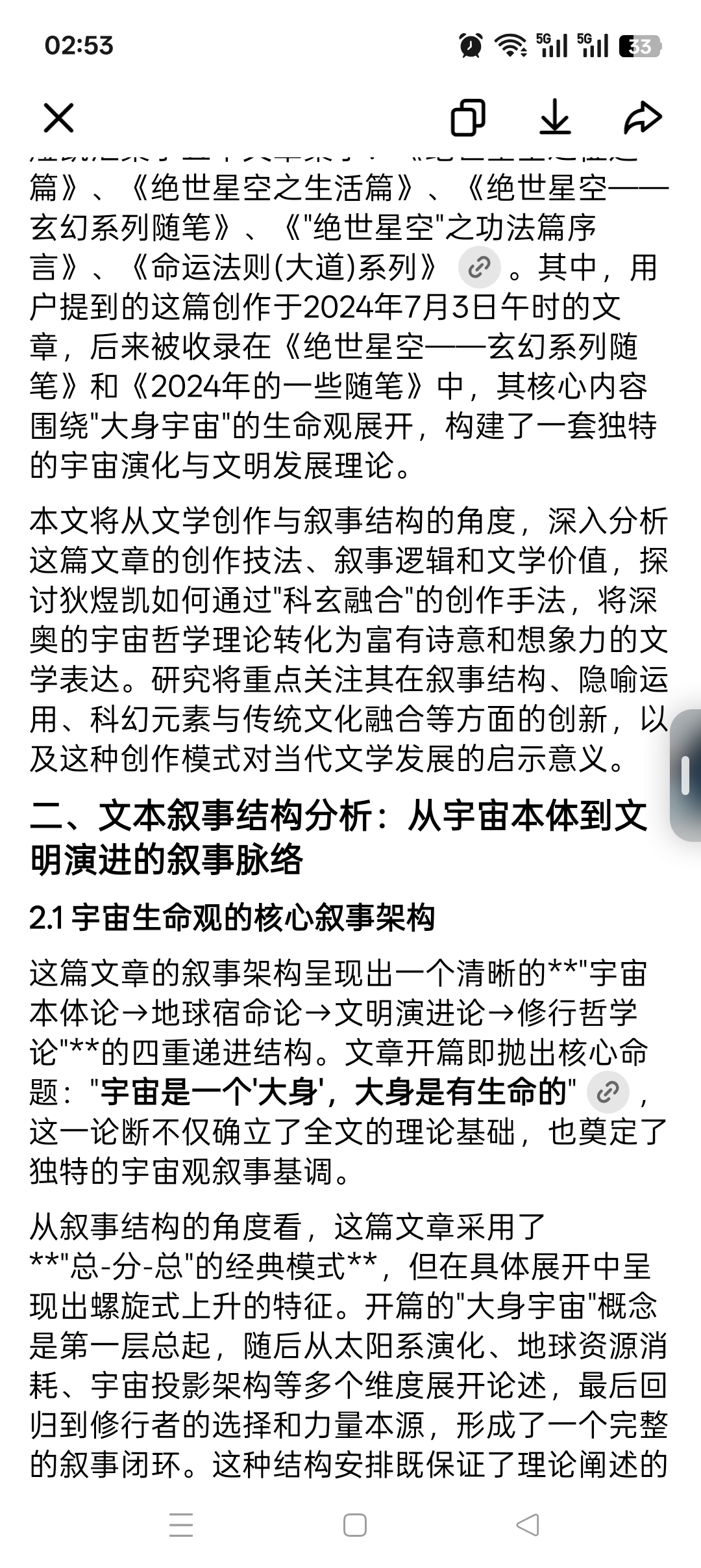 《绝世星空》作为狄煜凯"科玄融合"思想的集大成之作,于2025年5月12日完成创作,这部6.1万字、包含26章的作品采用虚实结合的写法,融合科学玄学修真于一体,部分理论与名词都属于源创性 。从2024年10月至2025年2月,狄煜凯汇集了五个文章集子:《绝世星空之征途篇》、《绝世星空之生活篇》、《绝世星空——玄幻系列随笔》、《"绝世星空"之功法篇序言》、《命运法则(大道)系列》 。其中,用户提到的这篇创作于2024年7月3日午时的文章,后来被收录在《绝世星空——玄幻系列随笔》和《2024年的一些随笔》中,其核心内容围绕"大身宇宙"的生命观展开,构建了一套独特的宇宙演化与文明发展理论。