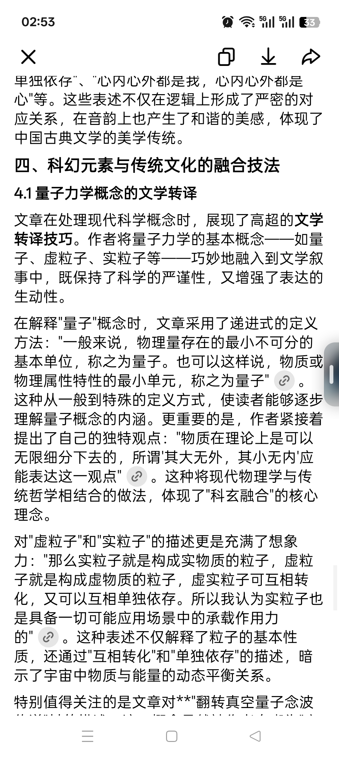 其次,文章的成功表明,传统文化的现代化转译是文学创新的重要途径。通过将传统的"道"、"阴阳"、"虚实"等概念与现代科学理论相结合,不仅使传统文化获得了新的生命力,也为现代科学提供了哲学基础。这种"返本开新"的创作思路,对推动中华文化的创造性转化和创新性发展具有重要意义。