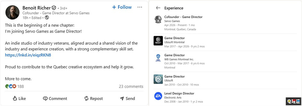 根据领英的履历显示,《刺客信条》“代号女巫”总监伯努瓦·里谢(Benoit Richer)已经离开育碧加入Servo Games担任游戏总监。他在今年1月份才上任“代号女巫”的游戏总监一职。如今他成为继创意总监克林特·霍金离职后,第二位离职的核心领导层。对于自己的跳槽,伯努瓦·里谢表示是“新篇章的开始”。克林特·霍金是在《刺客信条:黑旗》创意总监让·盖斯东担任Vantage Studios的《刺客信条》内容主管后离职,不知道伯努瓦·里谢离职是否也与育碧结构变动有关。
