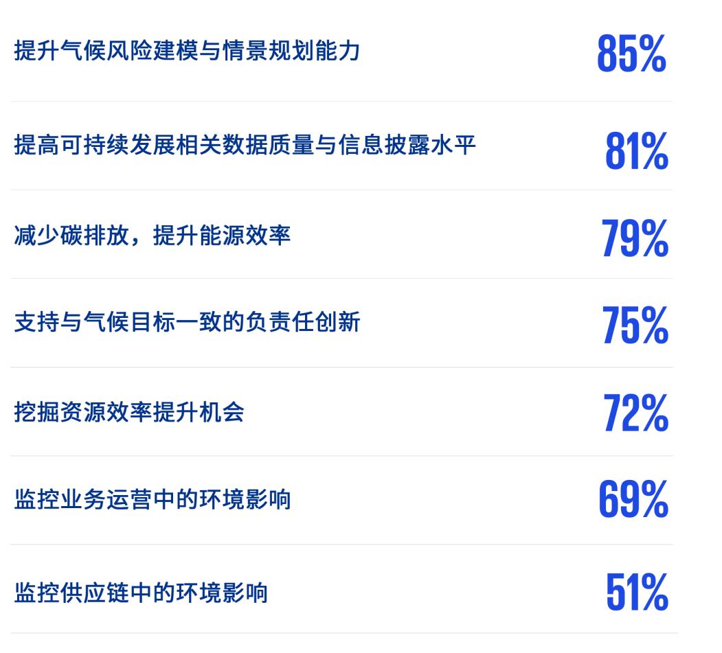 与其他行业类似,人工智能已成为银行业ESG发展的重要赋能引擎,81%的首席执行官认为人工智能将在优化ESG信息披露方面发挥关键作用。在具体应用中,85%的首席执行官表示人工智能能显著提升气候风险建模的精准度,72%表示人工智能有助于挖掘资源效率提升机会,同时人工智能还能优化银行自身碳排放管理、识别“漂绿”风险,更能为客户供应链脱碳、净零目标实现提供专业支持。
