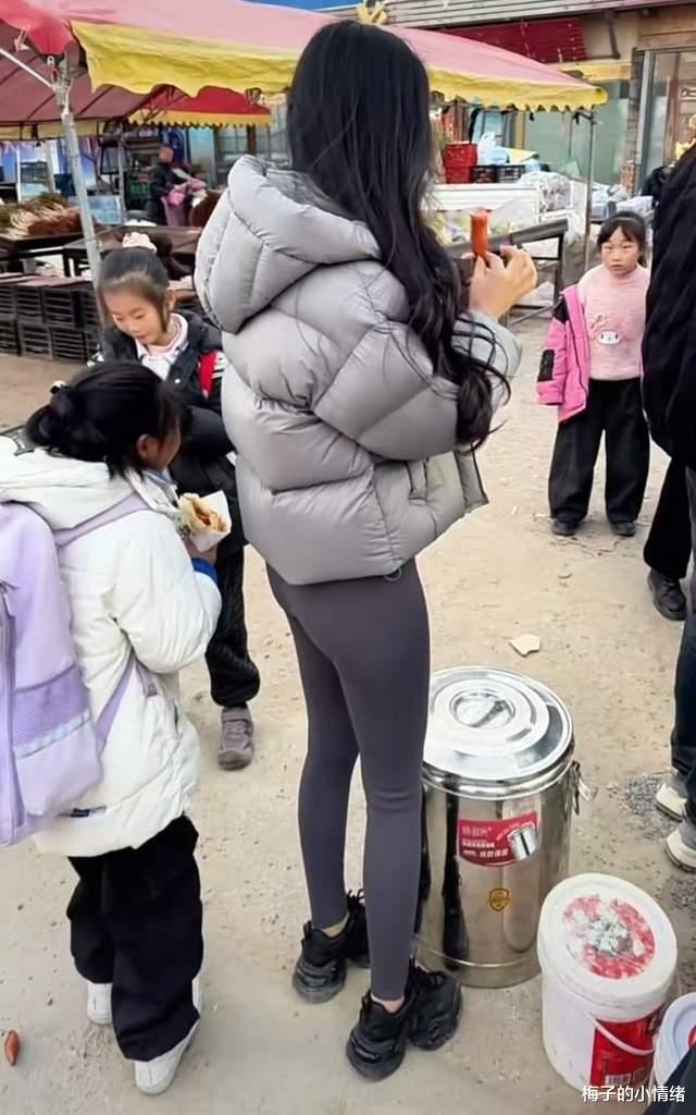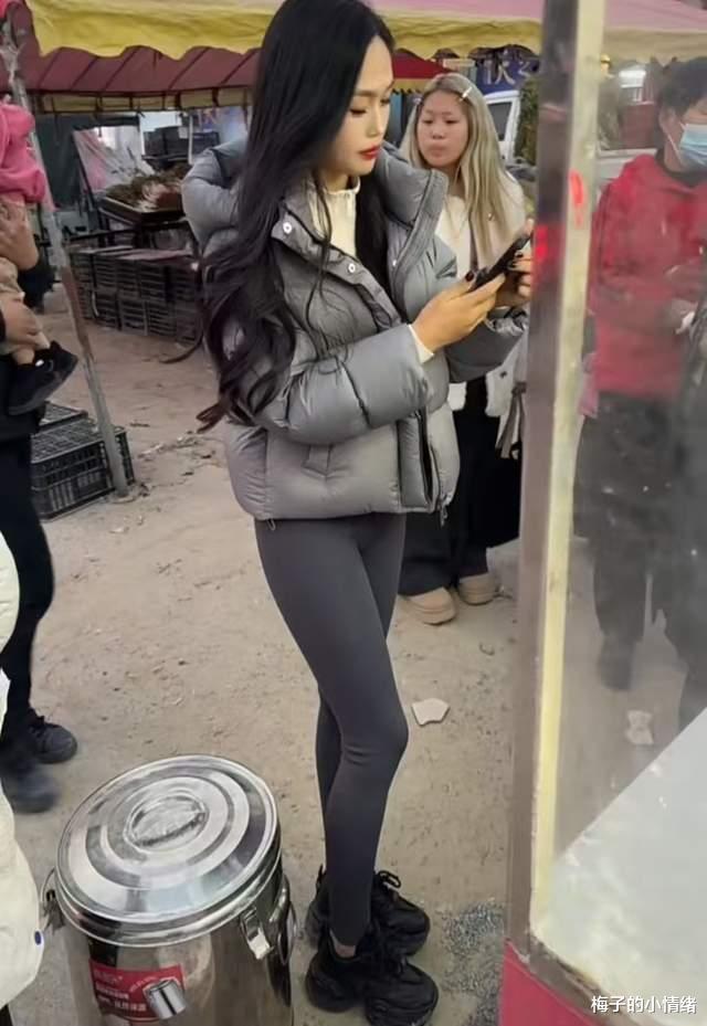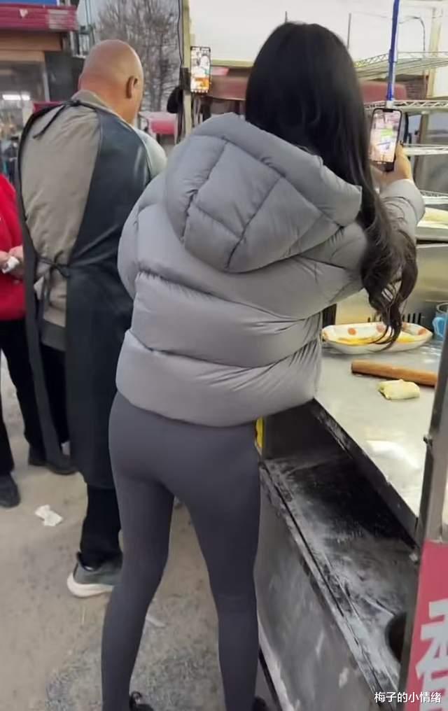 吃完烤肠后女子觉得不尽兴,又要排队买了一个鸡蛋灌饼,因为羽绒服实在太短,再加上女子没有穿别的什么长款衣服遮挡,扫码付钱的时候整个瑜伽裤全部露在外面,身材更是看得明显。