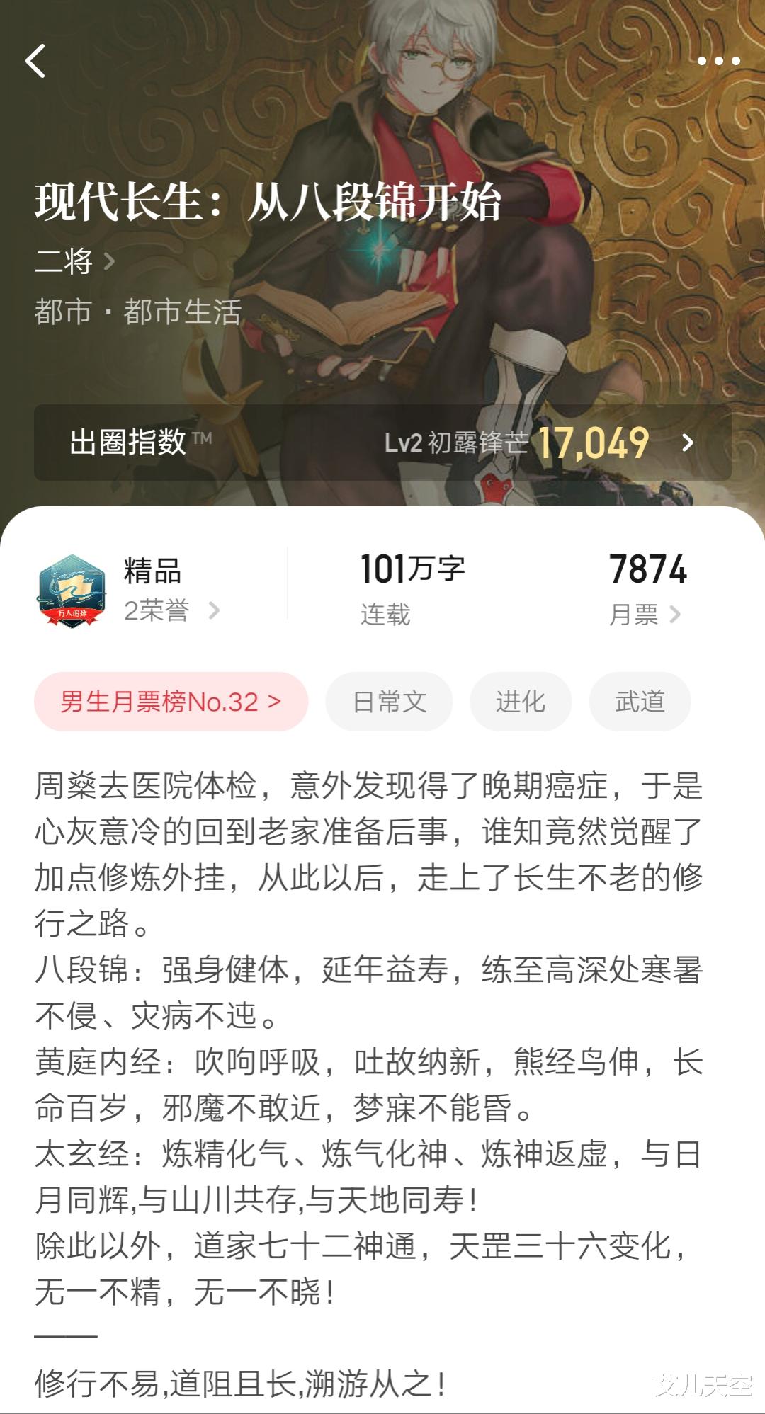 小说属于现代背景的武道长生文,金手指是一个属性面板,练武可以为自己加点增寿。开局和之前的人走偏锋的《我在现实世界加点修行》类似。
