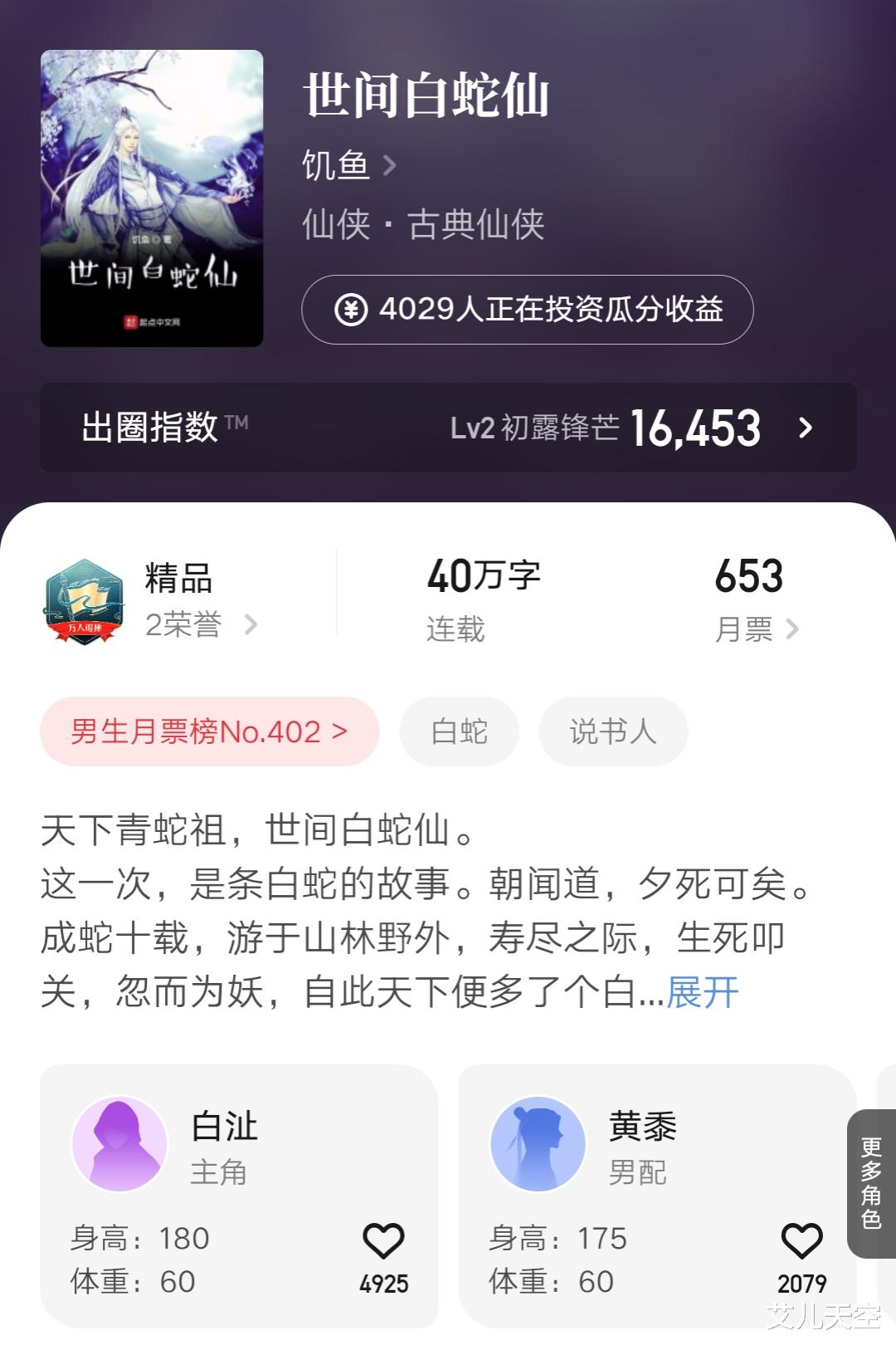作者之前连续写过两本洪荒背景的青蛇文,不过成绩都很一般,这本白蛇文倒是起飞了。喜欢看异兽类古典仙侠文的可以关注一下。