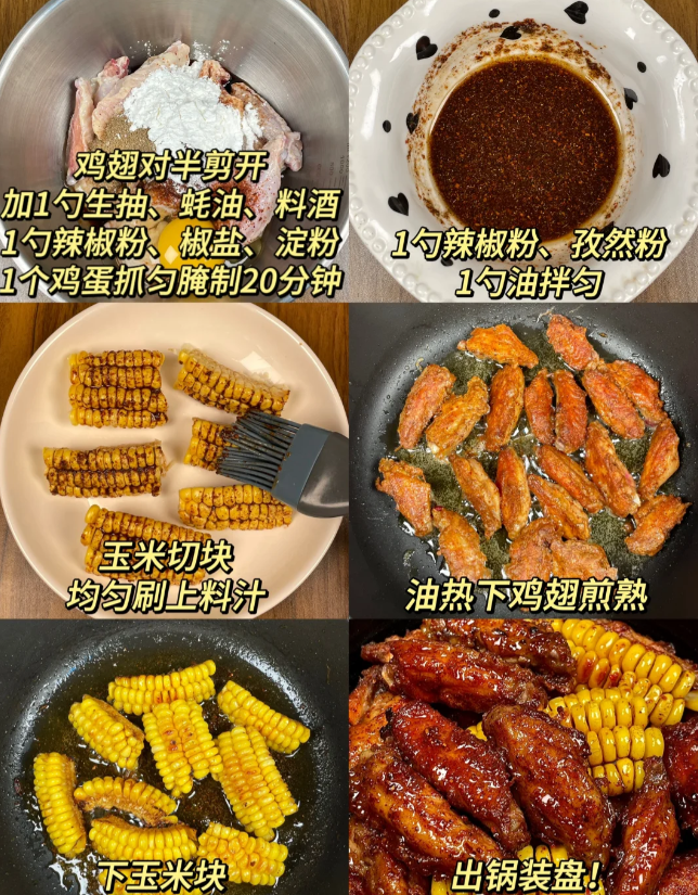 做这道菜,选材要趁鲜。鸡翅推荐用鸡中翅,肉多骨小、口感最佳;买回来剪掉两端尖角,清水浸泡15分钟去血水,洗净沥干。玉米用新鲜甜玉米或冷冻玉米粒都行——如果是整根玉米,对半切开再剁成小段;如果用玉米粒,提前焯水1分钟沥干,这样炒出来更香还不易焦。