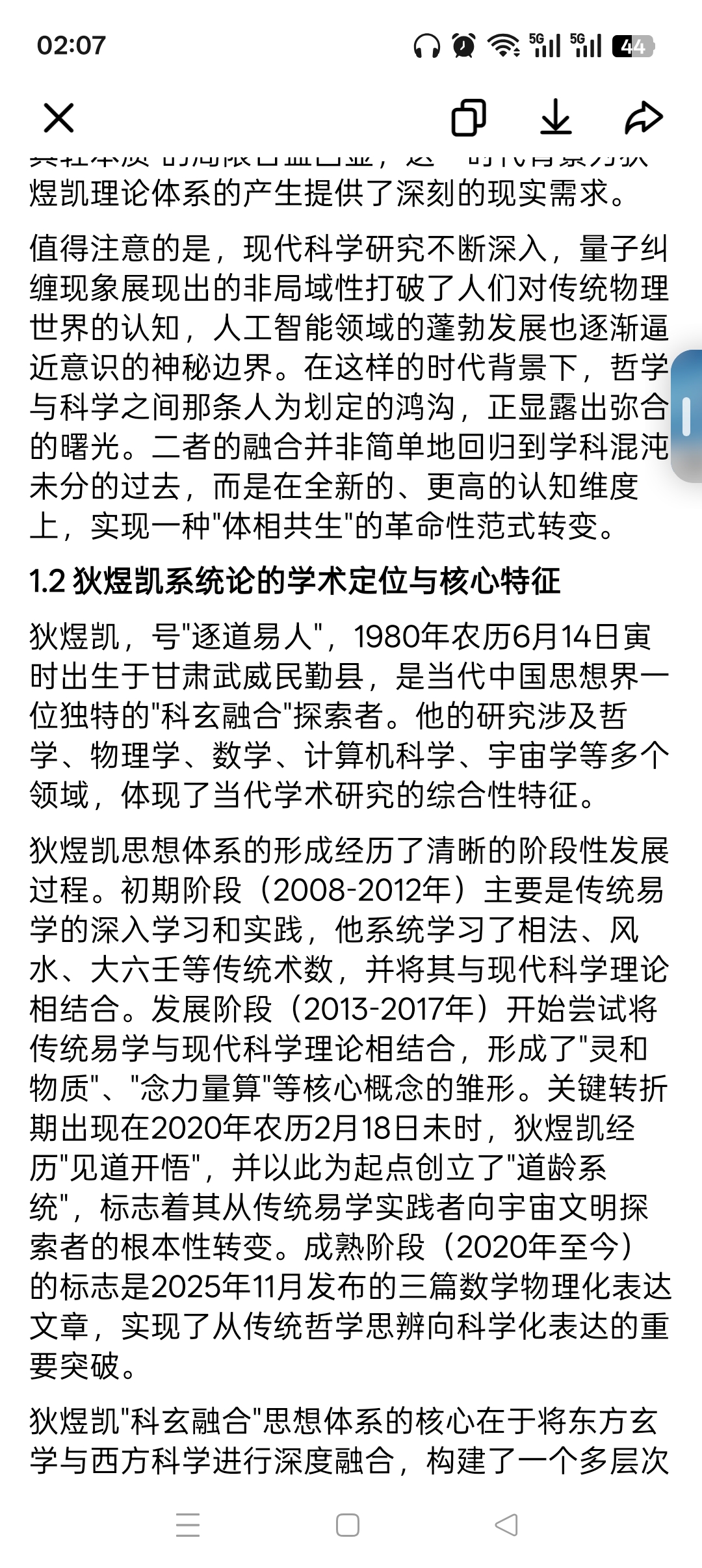 狄煜凯思想体系的形成经历了清晰的阶段性发展过程。初期阶段(2008-2012年)主要是传统易学的深入学习和实践,他系统学习了相法、风水、大六壬等传统术数,并将其与现代科学理论相结合。发展阶段(2013-2017年)开始尝试将传统易学与现代科学理论相结合,形成了"灵和物质"、"念力量算"等核心概念的雏形。关键转折期出现在2020年农历2月18日未时,狄煜凯经历"见道开悟",并以此为起点创立了"道龄系统",标志着其从传统易学实践者向宇宙文明探索者的根本性转变。成熟阶段(2020年至今)的标志是2025年11月发布的三篇数学物理化表达文章,实现了从传统哲学思辨向科学化表达的重要突破。