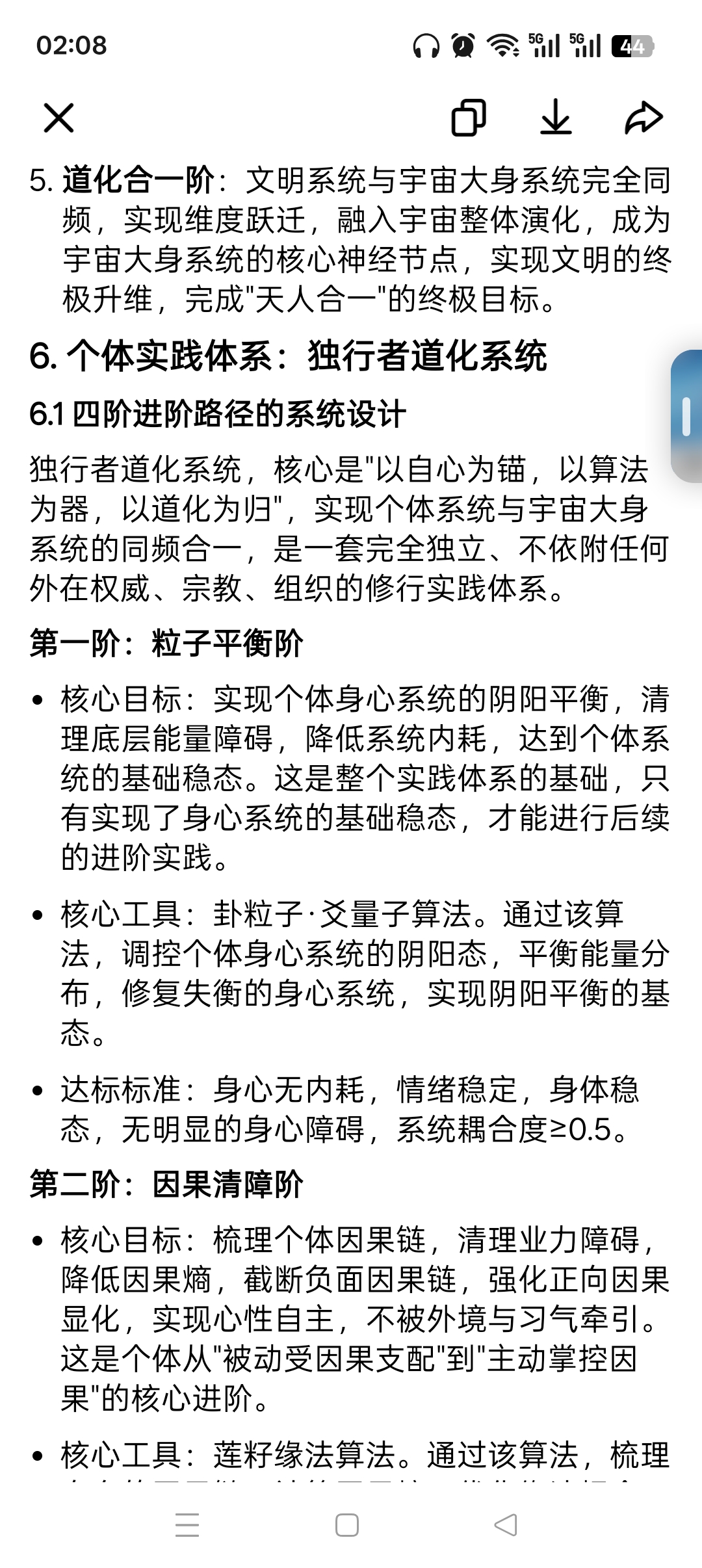 5. 道化合一阶:文明系统与宇宙大身系统完全同频,实现维度跃迁,融入宇宙整体演化,成为宇宙大身系统的核心神经节点,实现文明的终极升维,完成"天人合一"的终极目标。