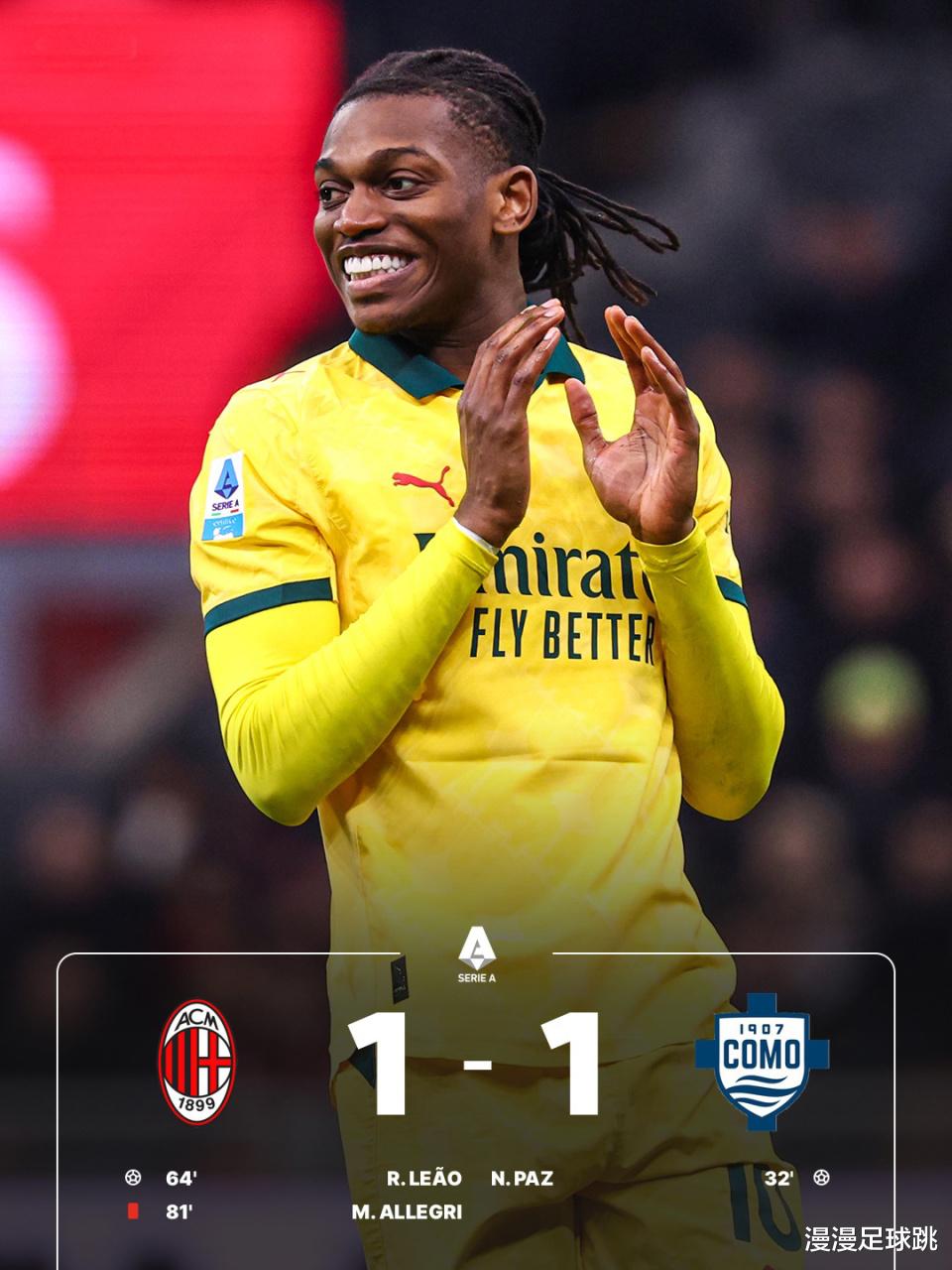 第70分钟,福法纳头球顶高;随后莱奥近距离头球击中横梁弹出。短短几分钟,两次黄金机会擦肩而过。科莫则稳守反击,节奏被压得极低,最终比分定格在1-1,米兰又丢分了!
