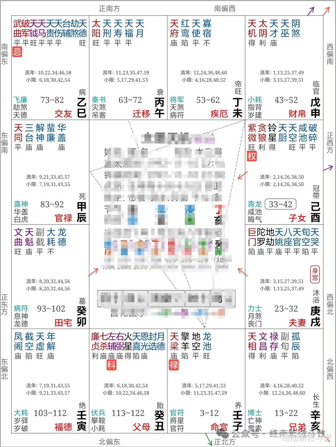大夫与本忌重叠,天干丁,天同权、巨门忌都入了本命夫官这一线,本夫原来就有视同自化忌,相当于两个忌一个权的组合,这个婚姻的状态非常暴躁,一言不合的暴躁,与孩子、桃花、赚钱有关的种种婚后问题。