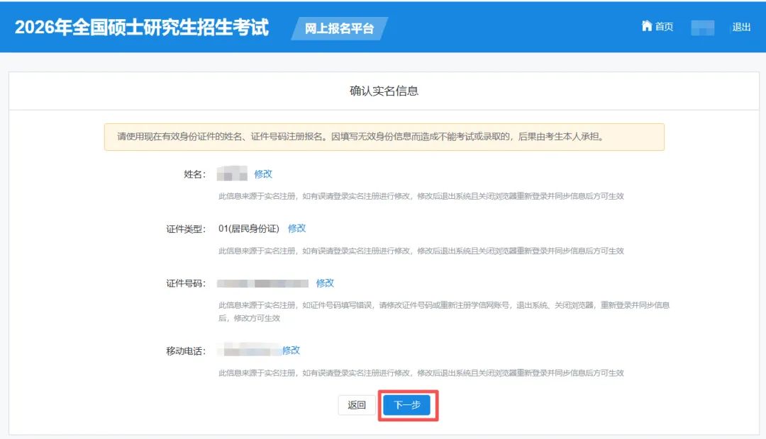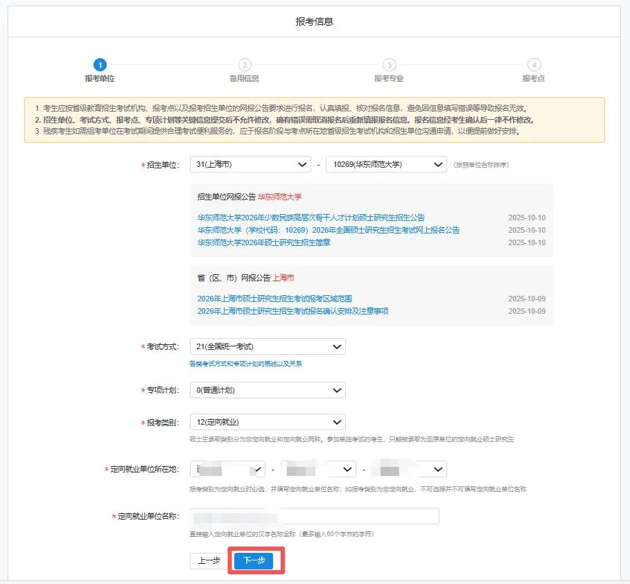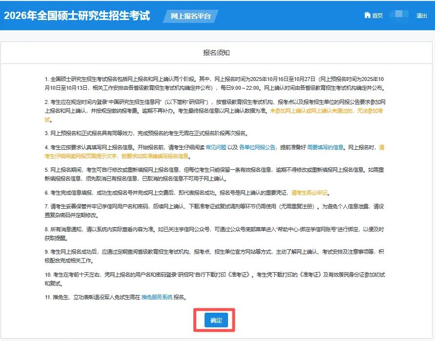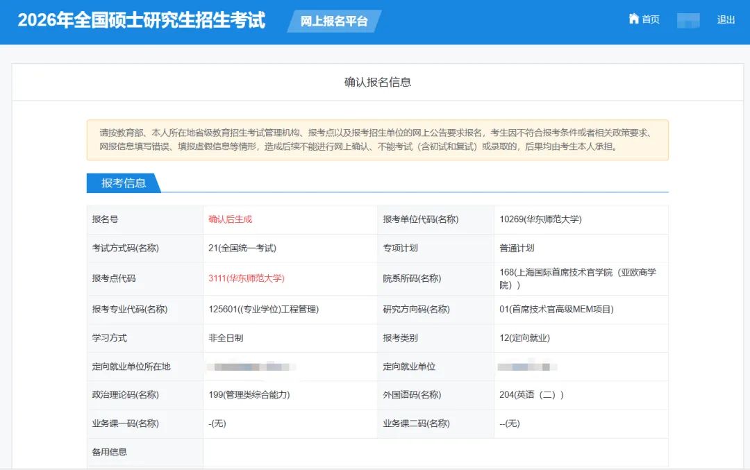 【注意】网上报名后,考生本人需对所填报信息仔细核对;网上确认或现场确认时,考生本人对网上报名信息要进行认真核对并确认。经考生确认的报名信息在考试、复试及录取阶段一律不作修改,因考生填写错误引起的一切后果由其自行承担。