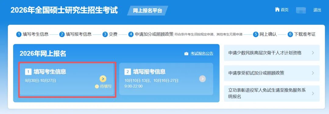 1、填写完毕“考生信息”之后——返回首页——继续“填写报考信息”。
