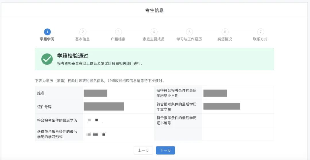 【注意】一般情况下,学历信息可被快速校验,如遇网络拥堵等特殊情况,将出现“进行中”的状态,考生可以继续填写考生信息中的其他部分,不影响接下来的操作。未能通过学历网上校验的考生,请务必仔细核查并更正填报的姓名、证件号码、毕业学校、毕业年月、学历、学历证书编号、学习形式等信息。