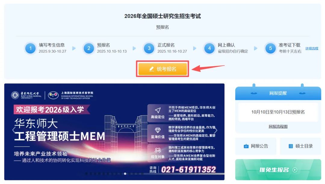 欢迎大家报考华东师范大学上海国际首席技术官学院工程管理硕士(MEM)项目!报考2026年入学华东师范大学MEM专业学位研究生的考生,需要登录中国研究生招生信息网进行报名。根据往年经验,为避免出现意外情况(例如:最适合、最方便的考点因报考人数达到上限而不再接受报考),建议各位考生尽早完成报名手续。