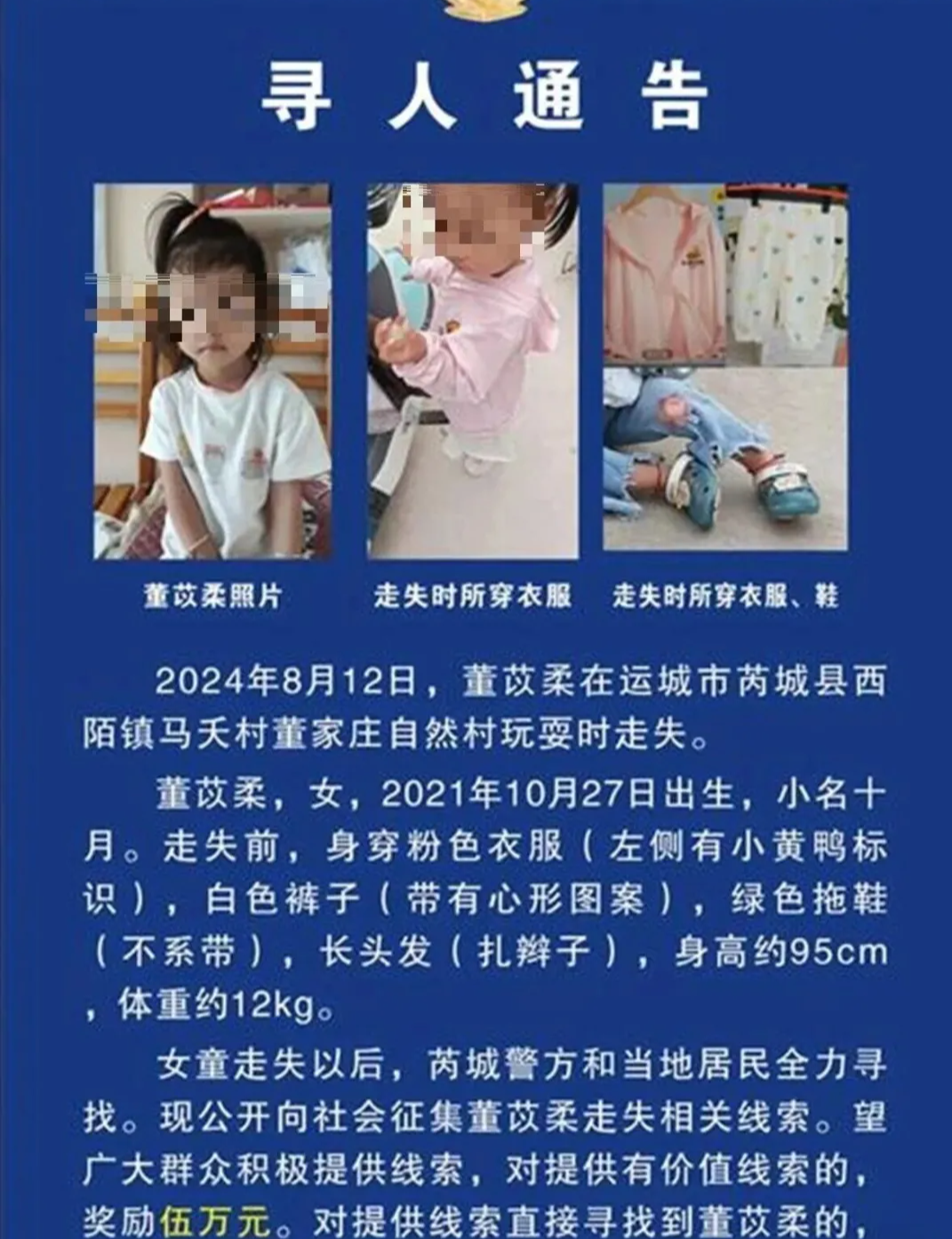 得知女儿失踪的消息后,孩子爸爸连夜赶回家中,而孩子的妈妈则还在回家途中,孩子爸爸称,他们愿意悬赏10万元的报酬,希望好心人能将孩子送回。