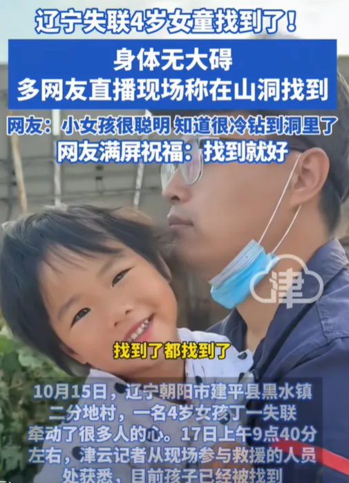 10月的辽宁建平县,秋意正浓。谁也没想到,一个4岁女童的失踪,会牵动辽蒙两地无数人的心,500余名警力、300余位志愿者、多架无人机和搜救犬,展开了一场与时间赛跑的生命救援。