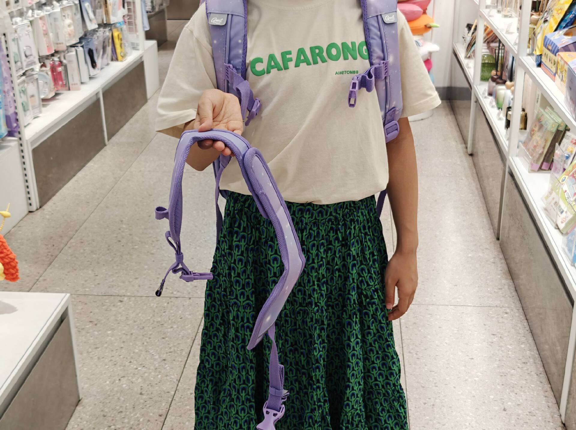 根据孩子的身高、胖瘦、穿衣的多少,调节这3处,目的是尽可能让书包贴合背部,实现肩部56%以上的压力分散。