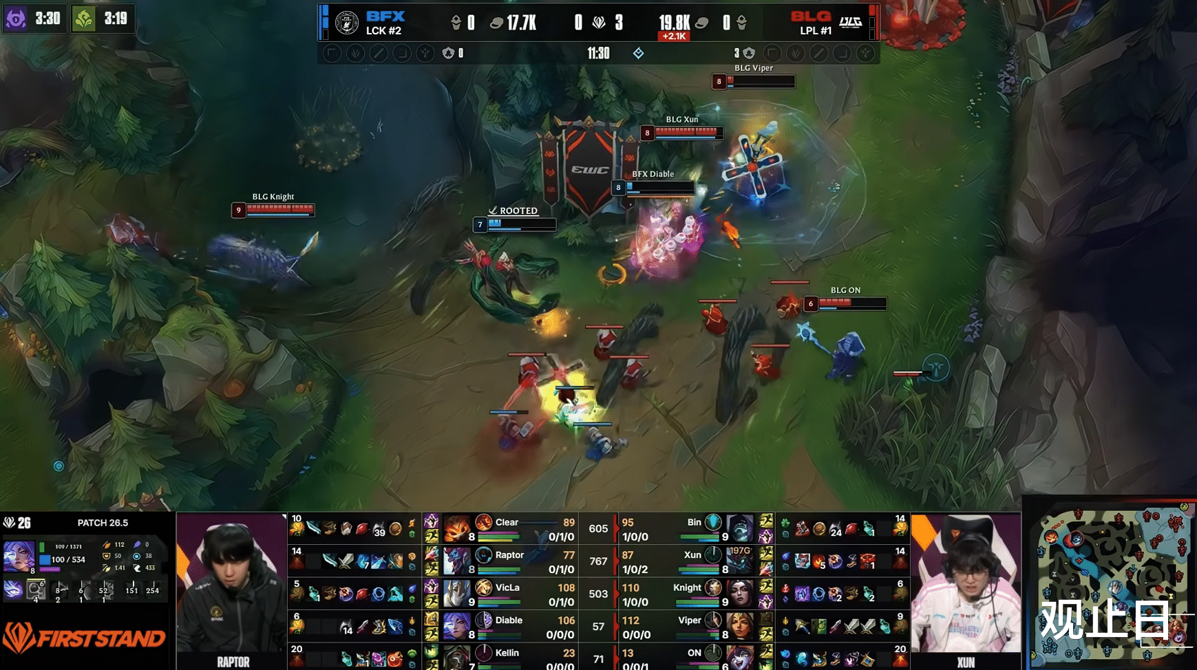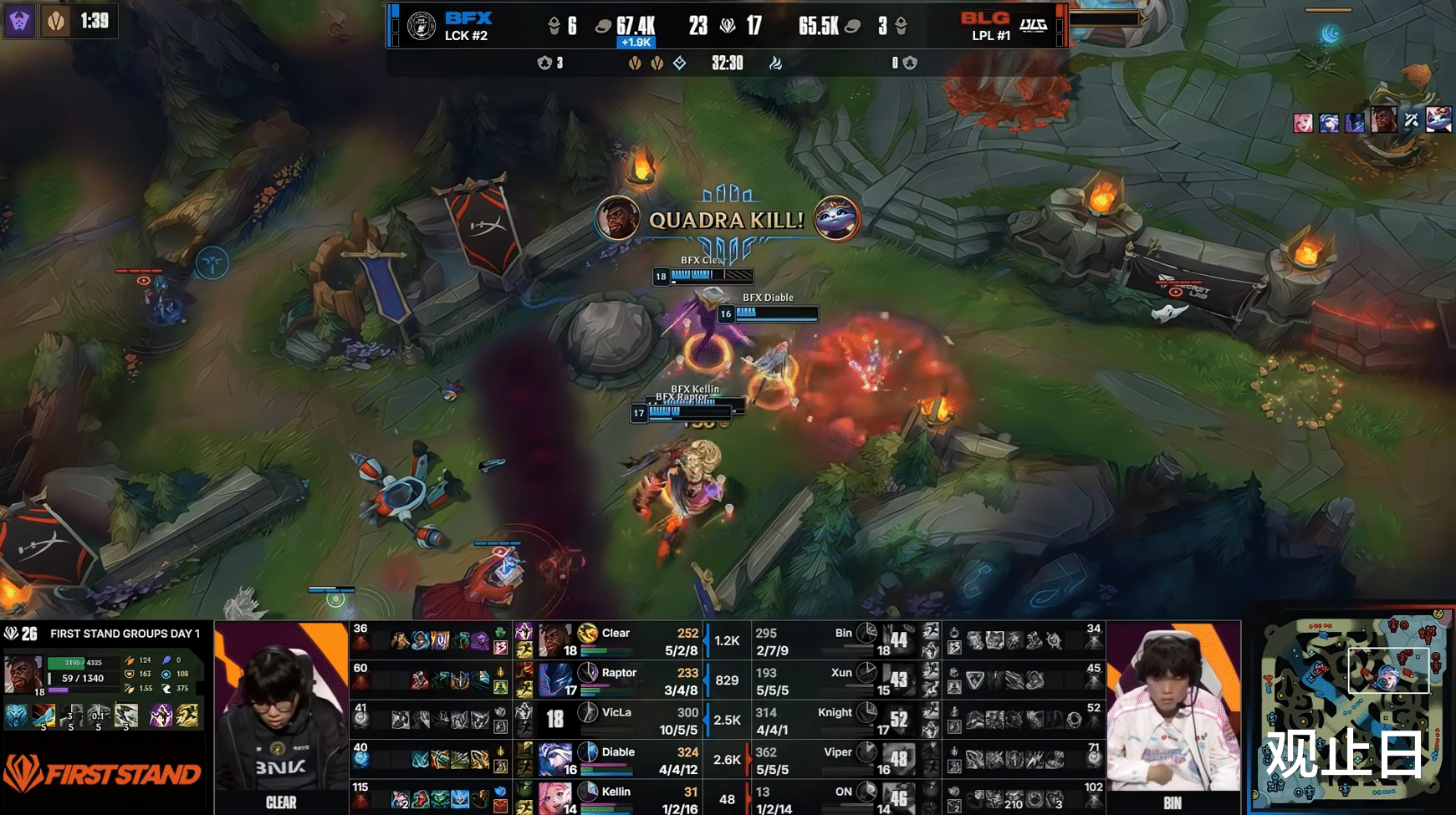 BLG中上依旧优势,knight兔子4-0开局。但BFX下路Diable的金克丝发育起来了。第25分钟关键团,Xun潘森开团未果,Clear鳄鱼切死Viper伊泽瑞尔,没人管的Diable金克丝拿下五杀,一波扳平比分。