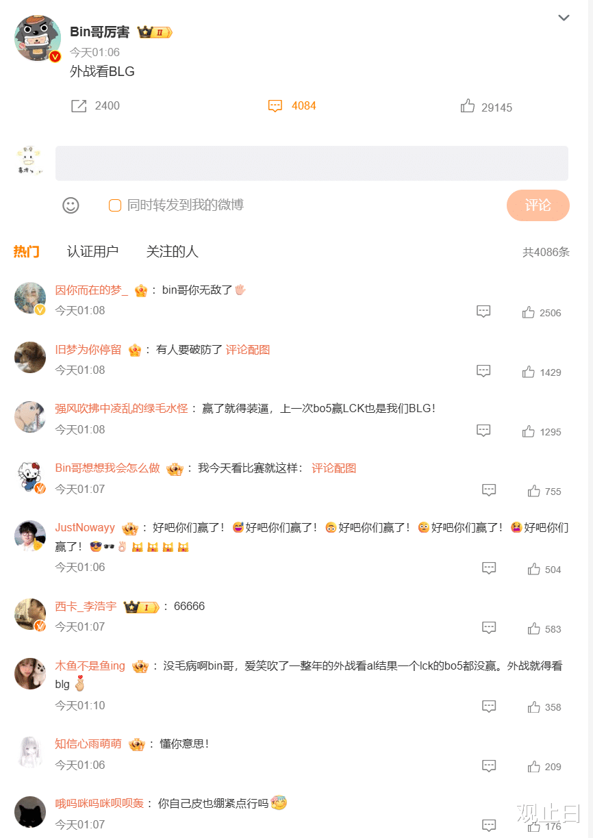Bin:第一局贾克斯游龙,第二局塞恩被吐槽“浪费手感”,赛后发微博“外战看BLG”。