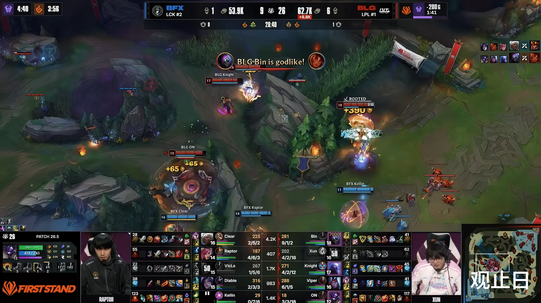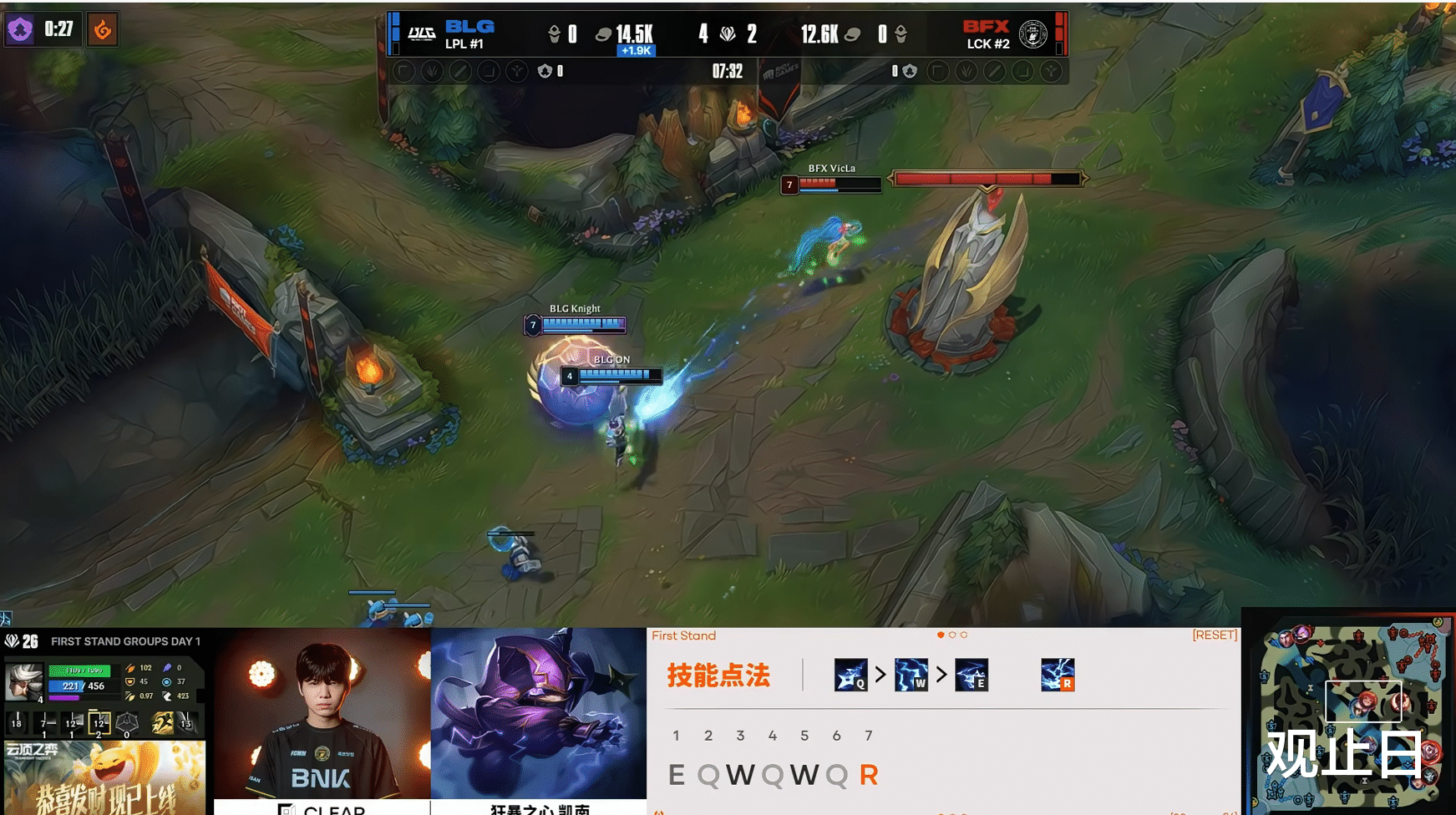 开局不到2分钟,knight瑞兹单杀VicLa岩雀,Bin贾克斯随后单杀Clear安蓓萨。第15分钟BLG打出1换5团灭BFX,第20分钟再来一波1换5。Bin最终11-1超神,网友调侃:“BFX这水平是怎么LCK第二的?”