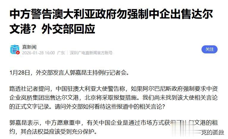 结语澳大利亚执意要求中方交还达尔文港,本质上就是一场不讲信誉、讨好美国的政治闹剧。