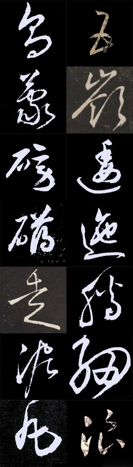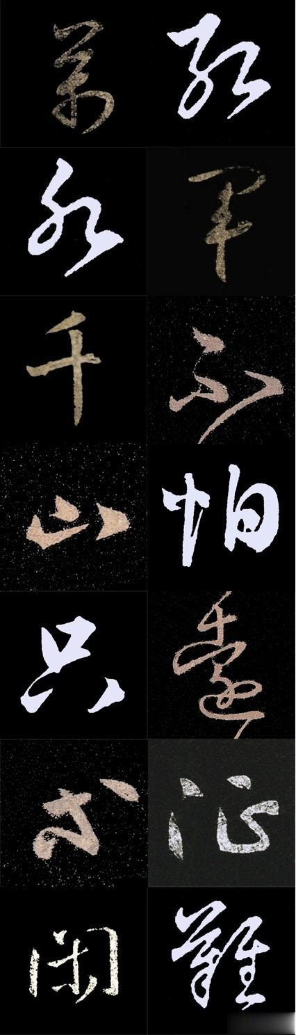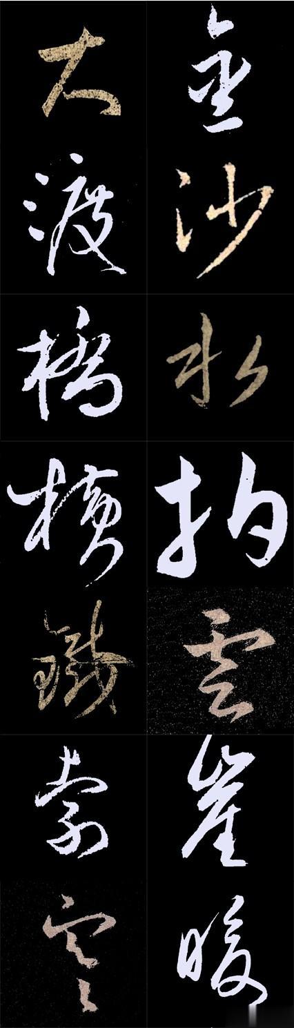 金(唐朝智永)沙水拍(明代王宠)云崖(明代文征明)暖(明代董其昌),大渡(唐朝张旭)桥(明代文征明)横(明代王铎)铁索(明代王铎)寒。