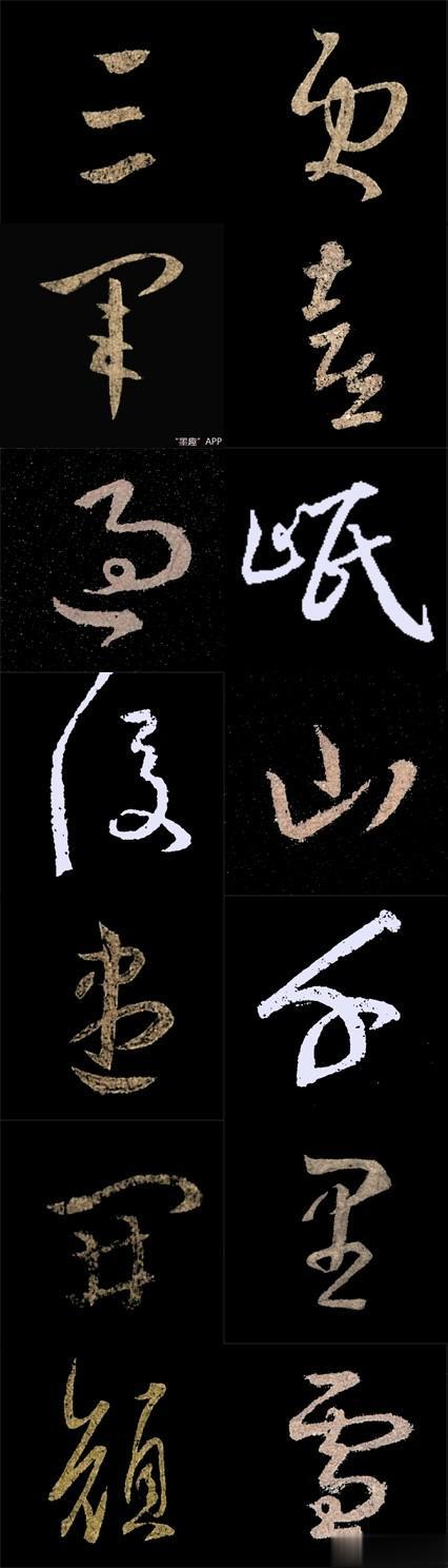 五岭(明代文征明)逶(明代祝允明)迤(明代祝允明)腾(明代祝允明)细(明代王铎)浪(唐朝智永),乌蒙(明代王铎)磅(近代王遽常)礴(宋代赵构)走(元朝赵孟頫)泥(唐朝怀素)丸(明代王铎)。