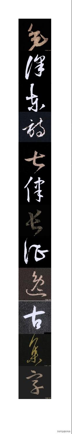 落款:毛(唐朝怀素)泽(明代董其昌)东(明代王铎)诗(元代赵孟頫)七律(唐朝怀素)长征(明朝张瑞图)逸古(唐孙过庭)集字