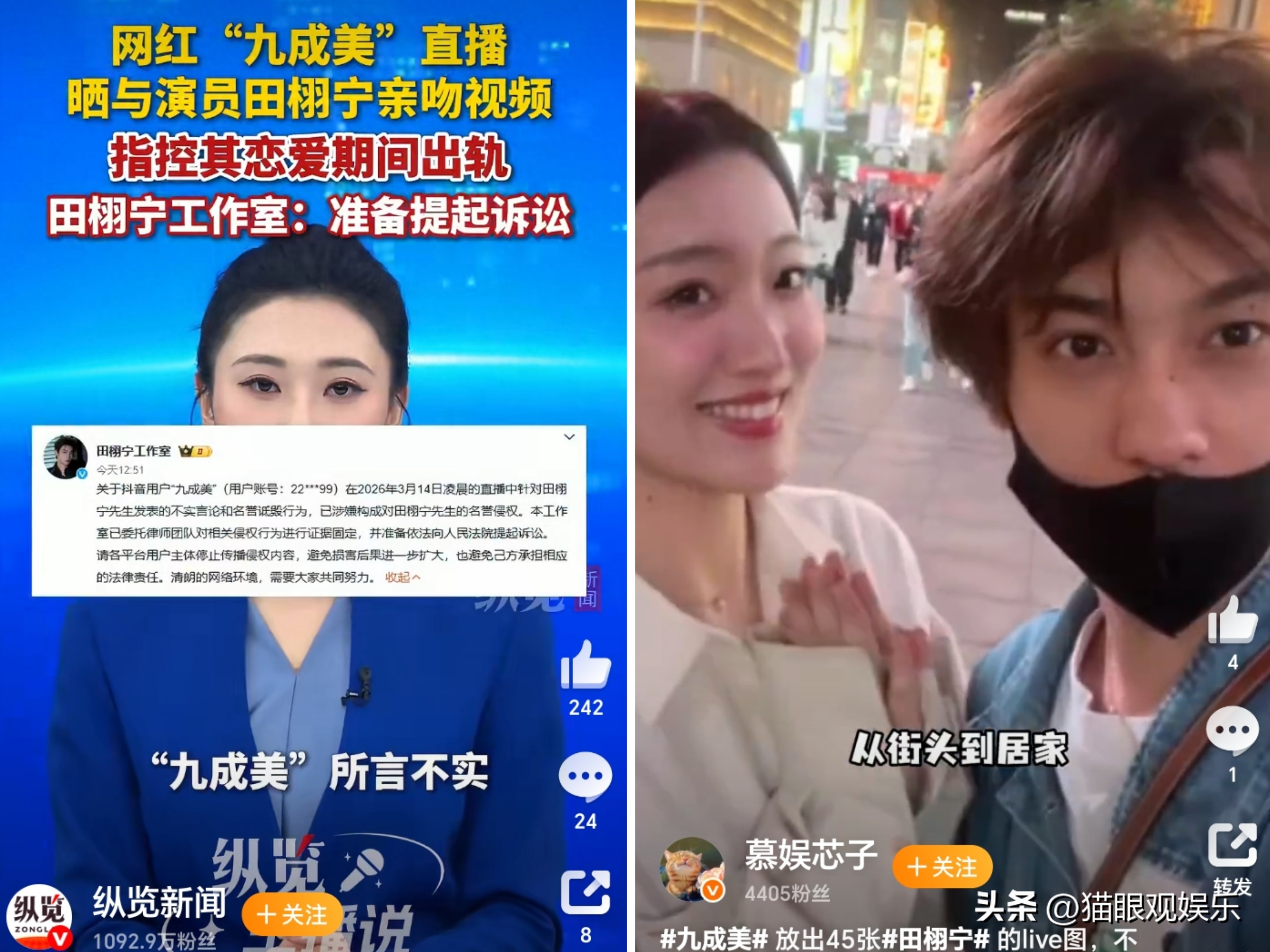 2026年3月14日,娱乐圈瓜田直接炸锅!网红九成美开直播上演“惊天爆料”,直指演员田栩宁恋爱期间出轨、隐瞒非婚生子,还甩出亲密合照、聊天记录当“铁证”,连“孩子生父”这种重磅细节都扒了出来,放话还握有更多证据,但为了保护儿童隐私暂时不公开。