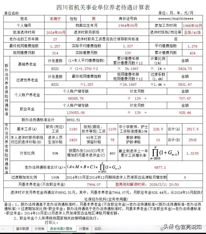 请读者朋友们参考笔者为解读李老师的计算表设计制作的系统,将李老师的基本数据输入《基本数据》工作表后,在《养老待遇计算表》工作表中更换李老师的姓名后就可自动计算生成这个表格: