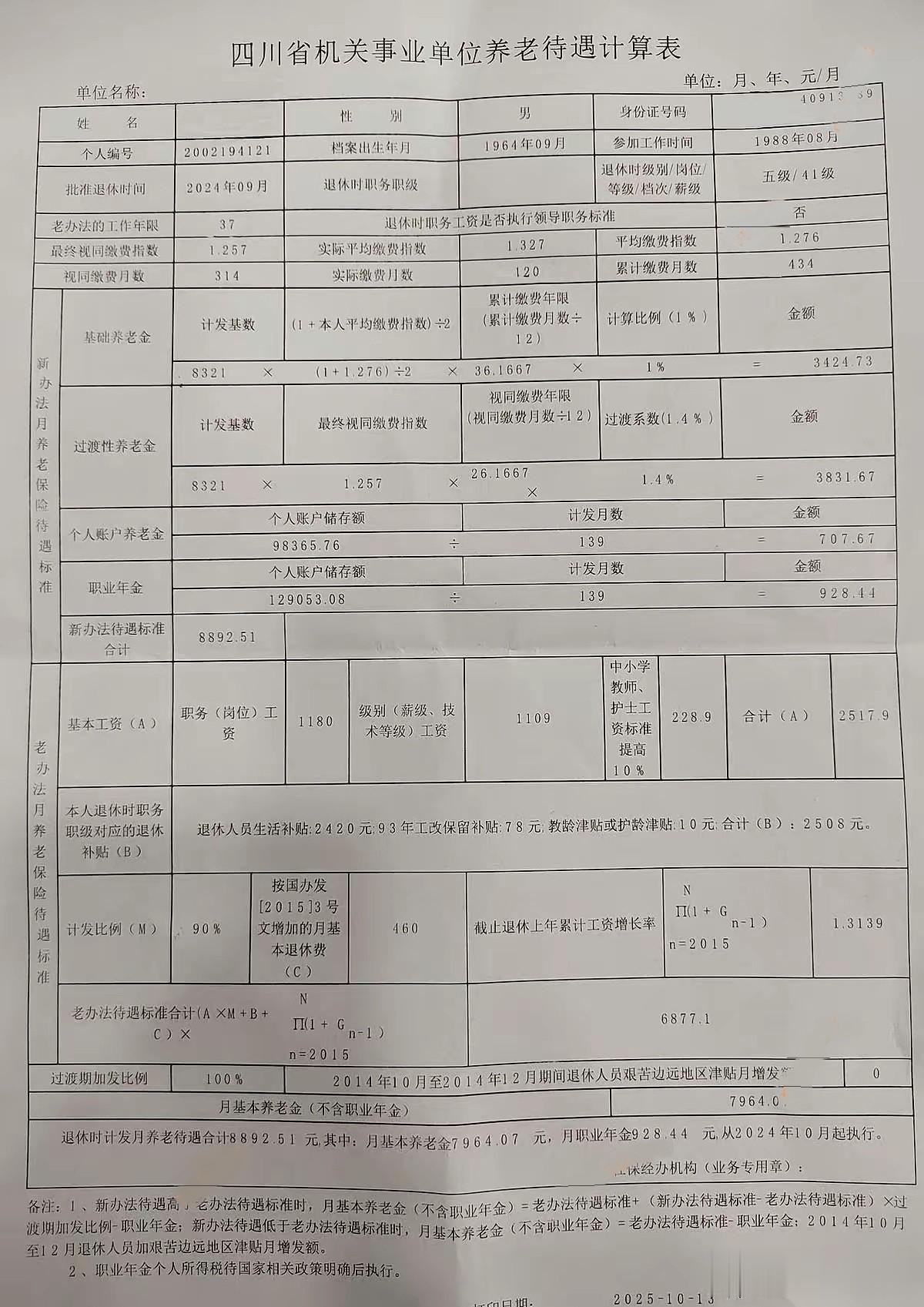 请看人社部门校准的李老师养老待遇计算表: