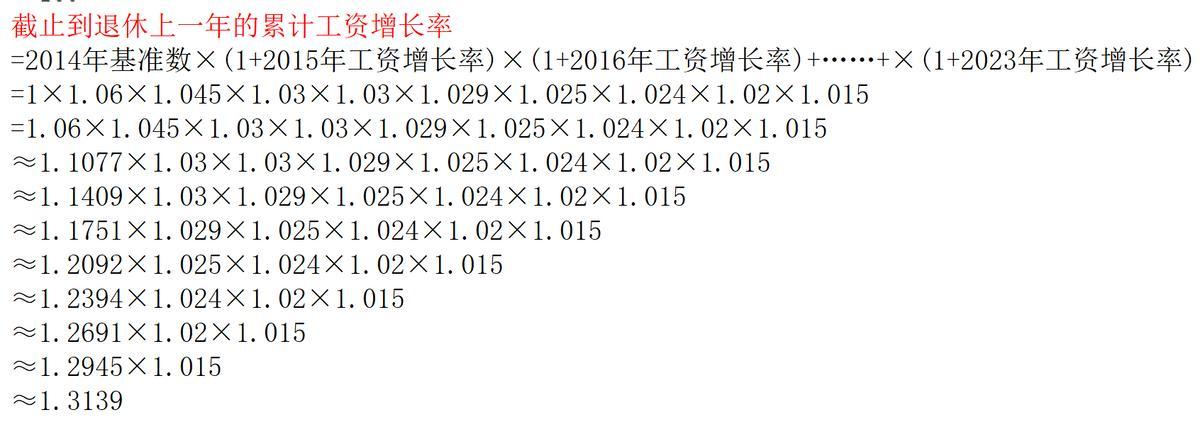 =2014年基准数×(1+2015年工资增长率)×(1+2016年工资增长率)+……+×(1+2023年工资增长率)