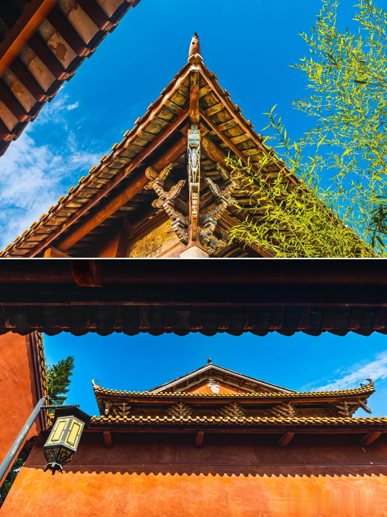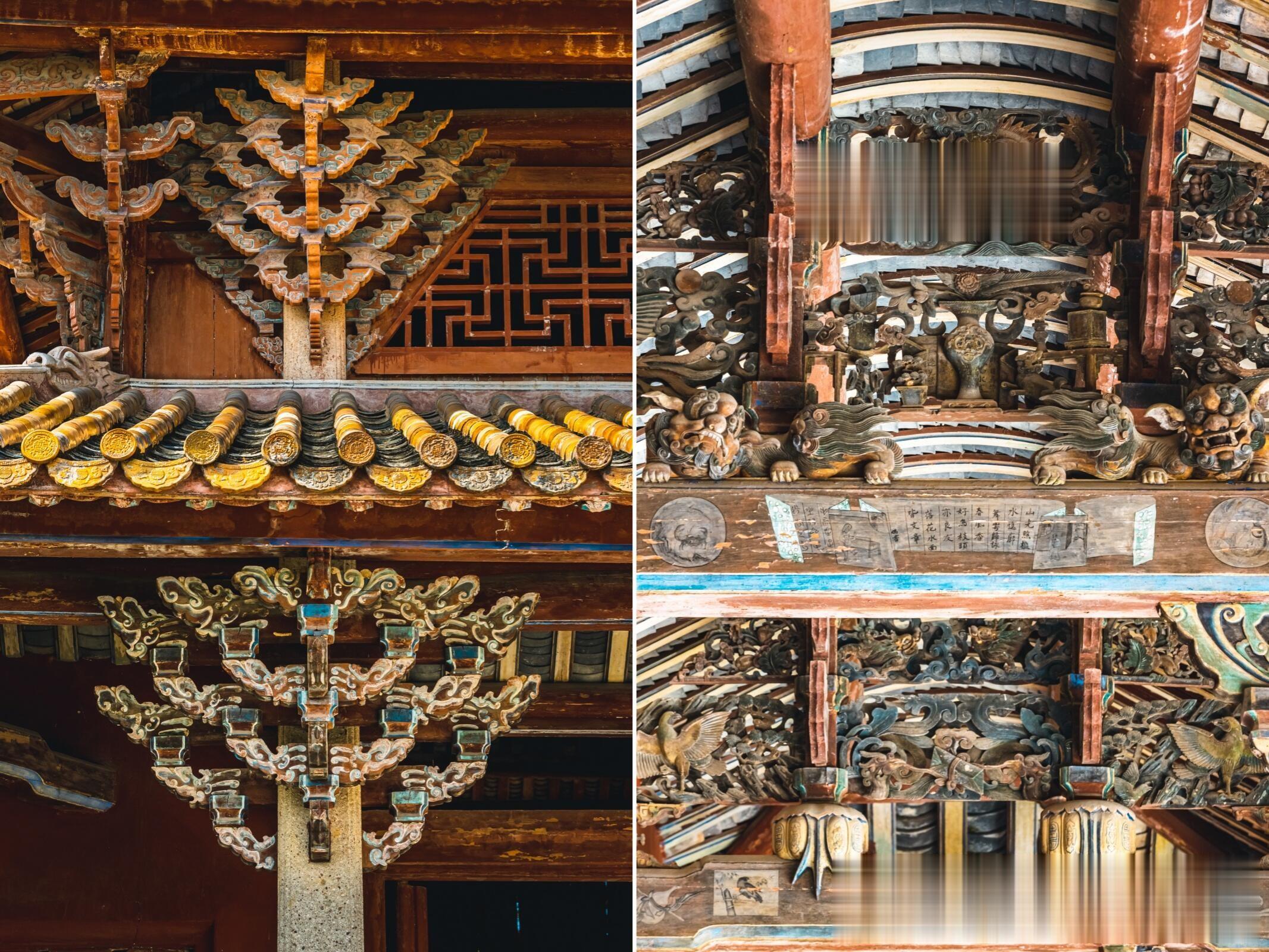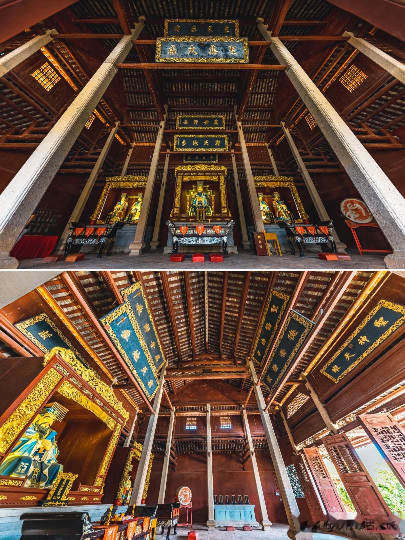 学宫的核心是大成殿,这座建筑面积488平方米的殿堂,堪称梅州地区古建筑的精品之作。重檐歇山顶的轮廓舒展大气,黄色与孔雀蓝相间的琉璃瓦在阳光下流光溢彩,殿脊上的双龙戏珠图案栩栩如生,仿佛要挣脱砖瓦的束缚,腾云驾雾而去。殿前的月台宽阔平整,是昔日祭祀孔子时举行大典的场所,如今仍能想象出当年香烟缭绕、礼乐齐鸣的庄严景象。踏入殿内,24根高达9米的八角梅花石柱稳稳撑起梁架,如此高大的石柱在国内学宫建筑中实属罕见,柱身的纹路历经数百年风雨仍清晰可辨,默默承载着屋顶的重量,也承载着厚重的文化使命。斗拱层层重叠出跳,雕花精美绝伦,没有一颗铁钉,全靠榫卯结构精密咬合,将古人的营造智慧展现得淋漓尽致。