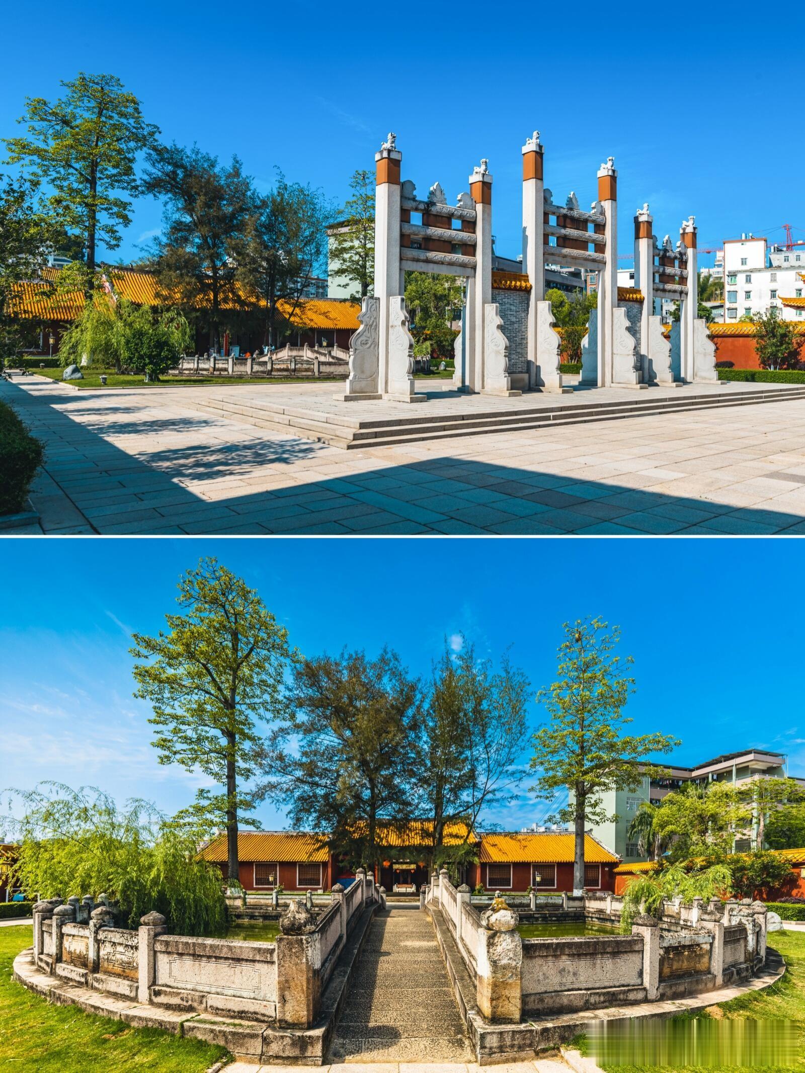 穿过棂星门,半月形的泮池静卧在中轴线之上,池上的石拱桥被称为“泮桥”,同样是只有状元及第者才能跨越的荣耀之桥。池水清澈,锦鲤游弋,谁能想到这汪池水的源头,竟藏着一段劝学佳话?明代嘉靖年间,学宫泮池水源枯竭,广东佥事施儒派人开凿圳道,将桂子岭源坑的泉水引入学宫,次年长乐士子颜端容便考中进士,成为建县后第一位进士。有人将此归功于泉水的灵气,施儒却坦言,疏通水源只为激励学子如泉水般源源不断汲取知识,而泉眼附近形似孔子与颜回论学的两块大石,更让这处水源被冠以“孔源”之名,成为崇文重教的精神象征。
